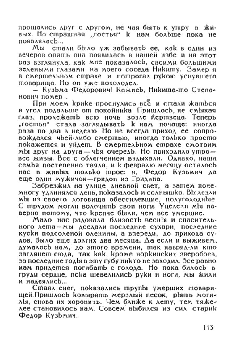 При моем крике проснулись все и стали жаться в угол подальше от покойника. Пришлось, не смыкая глаз, полежать всю ночь возле мертвеца. Теперь "гостья" стала заглядывать к нам почаще: иногда раза по два в неделю Но не всегда приход ее сопровождался чьей-либо смертью, иногда только просто покажется и уйдет. В смертельном страхе смотрим мы друг на друга — чья очередь. Но приходило утро -все живы. Все с облегчением вздыхали. Однако, наша семья постепенно таяла, и к февралю месяцу осталось нас в живых только трое: я, Федор Кузьмич да еще один мужичок — гридон из Гридина.