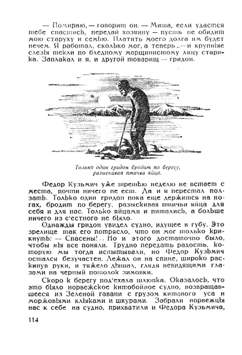 Однажды гридон увидел судно, идущее в губу. Это зрелище так его потрясло, что он мог только крикнуть: — Спасены!.. Но и этого достаточно было, чтобы мы все поняли. Трудно передать радость, которую мы тогда испытывали, но Федор Кузьмич остался безучастен. Лежал он на спине, широко раскинув руки, и тяжело дышал. глядя невидящими глазами на черный потолок зимовки.