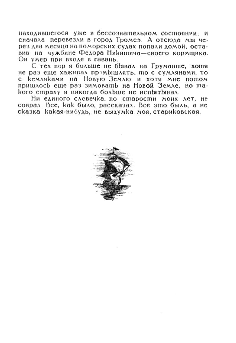 С тех пор я больше не бывал на Груманте, хотя не раз еще хаживал промышлять, то с сумлянами, то с кемляками на Новую Землю и хотя мне потом пришлось еще раз зимовать на Новой Земле, но такого страху я никогда больше не испытывал.