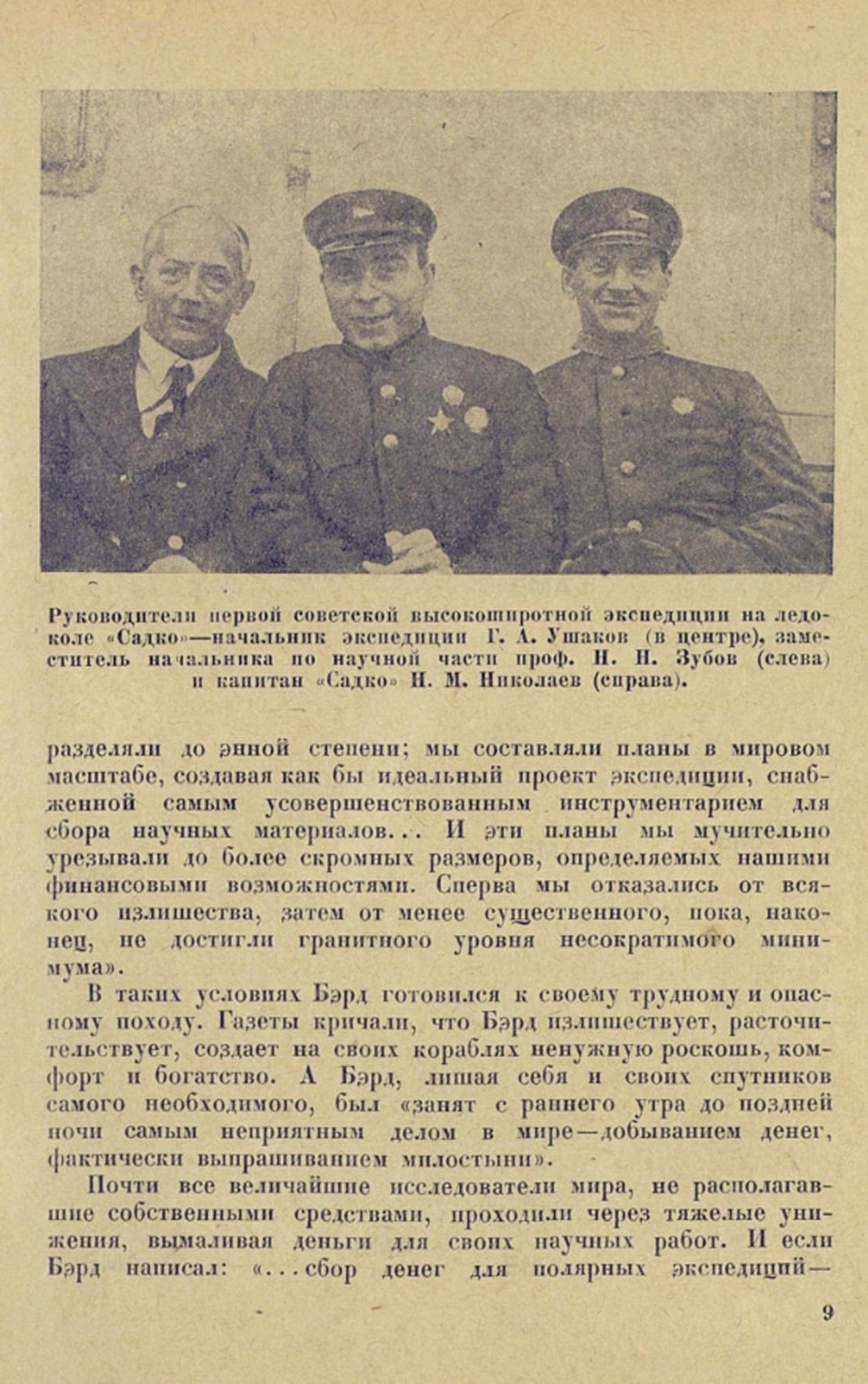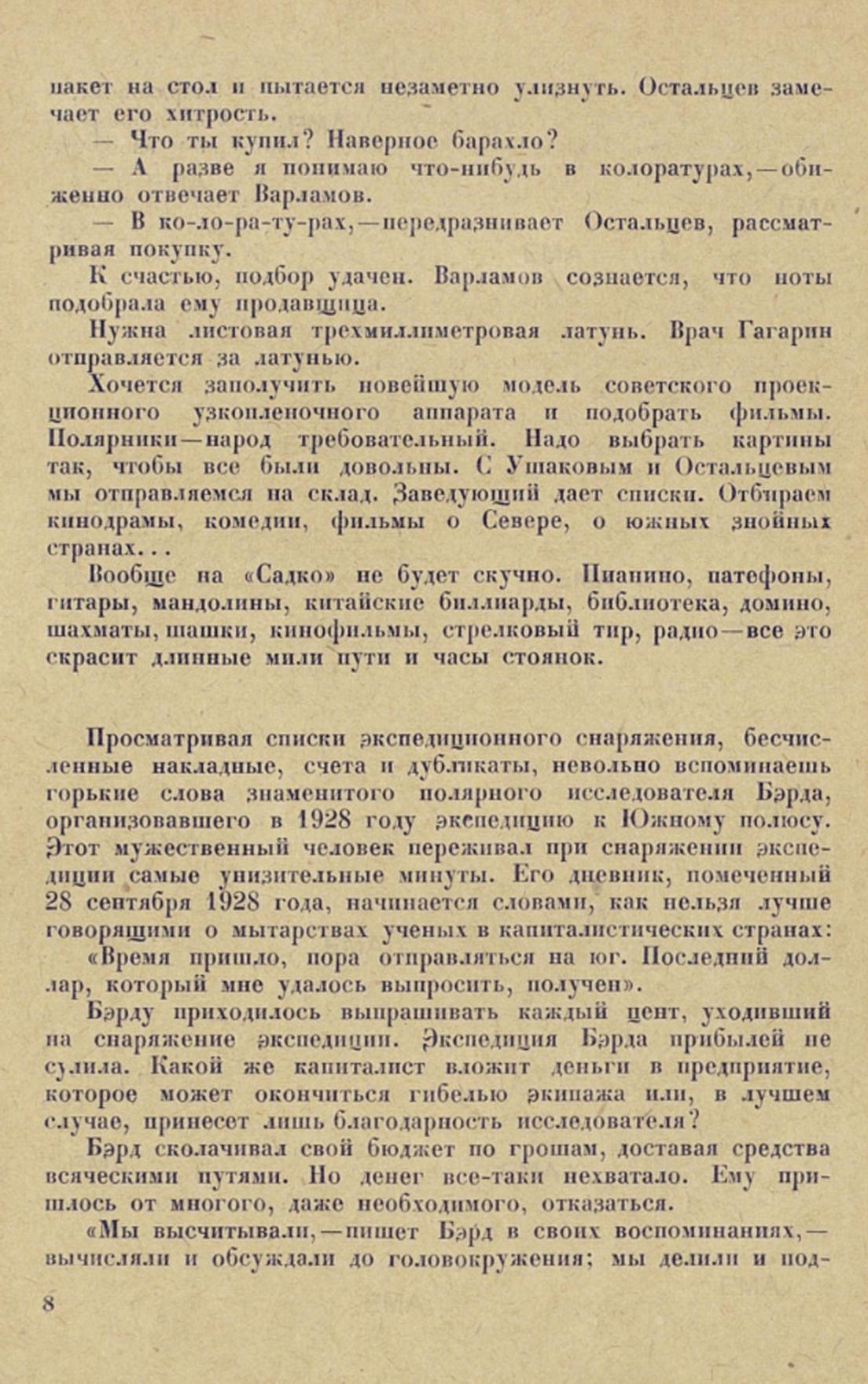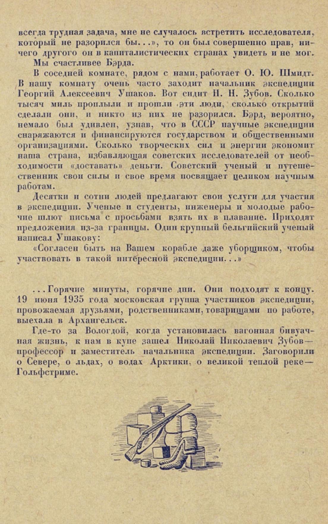В соседней комнате, рядом с. нами, работает О. Ю. Шмидт. It нашу комнату очень часто заходит начальник экспедиции Георгий Алексеевич Ушаков. Вот сидит Н. Н. Зубов. Сколько тысяч миль проплыли и прошли эти люди, сколько открытии сделали они, и никто из них не разорился. Бэрд, вероятно, немало был удивлен, узнав, что в СССР научные экспедиции снаряжаются и финансируются государством и общественными организациями. Сколько творческих сил и энергии экономит наша страна, избавляющая советских исследователей от необходимости «доставать» деньги. Советский ученый и путешественник свои силы и свое время посвящает целиком научным работам.