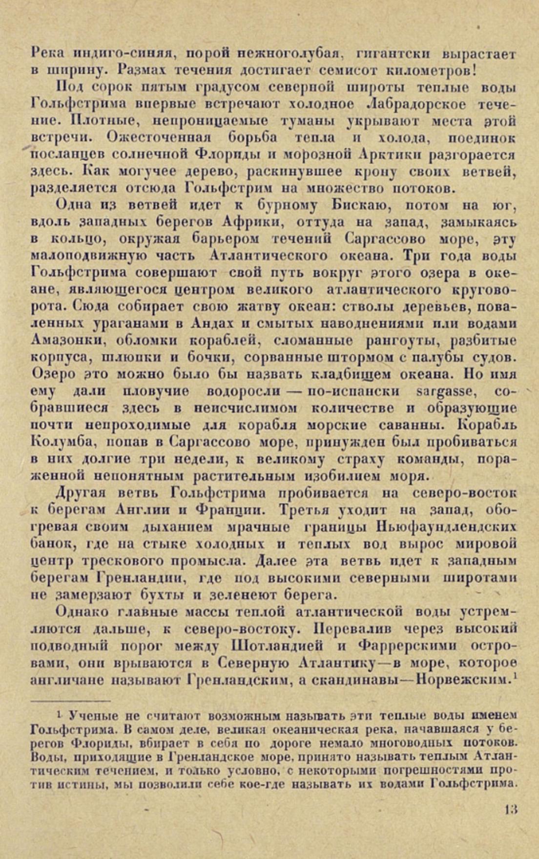 1 Ученые не считают возможным называть эти теплые воды именем Гольфстрима. В самом деле, великая океаническая река, начавшаяся у берегов Флориды, вбирает в себя но дороге немало многоводных потоков. Воды, приходящие в Гренландское море, принято называть теплым Атлантическим течением, и только условно, с некоторыми погрешностями против истины, мы позволили себе кое-где называть их водами Гольфстрима.[13]