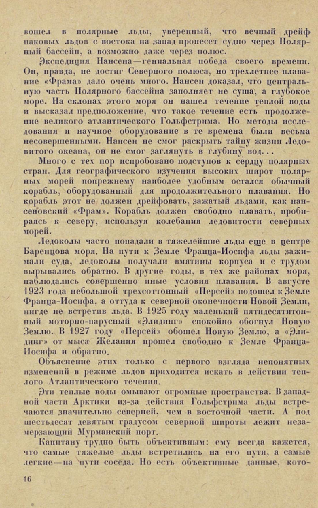 Много с тех пор испробовано подступов к сердцу полярных стран. Для географического изучения высоких широт полярных морей попрежнему наиболее удобным остался обычный корабль, оборудованный для продолжительного плавания. По корабль этот не должен дрейфовать, зажатый льдами, как нансеновский «Фрам». Корабль должен свободно плавать, пробираясь к северу, используя колебания ледовитости северных морей.