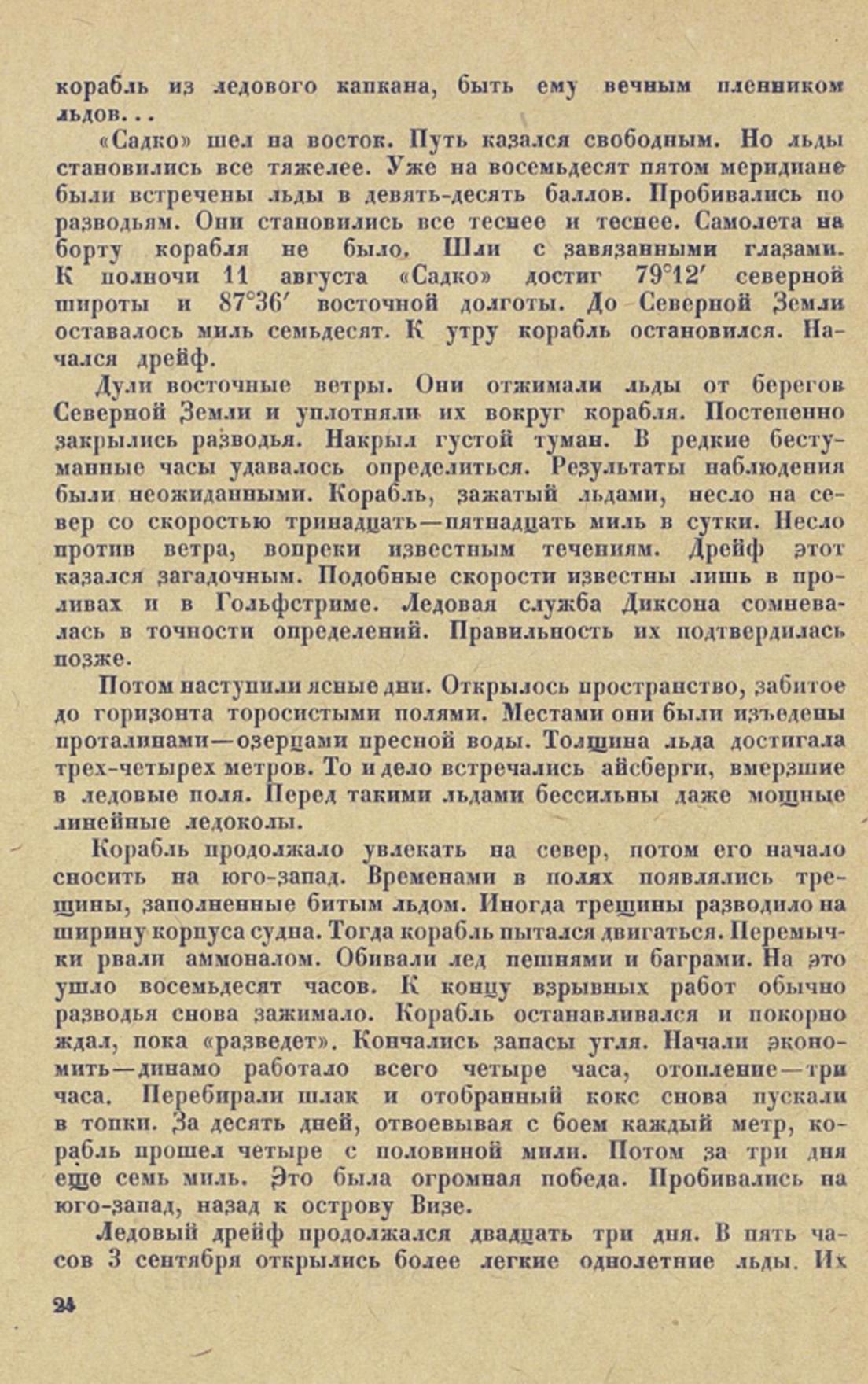 «САДКО» ПОД СОВЕТСКИМ ФЛАГОМВ Архангельске круглые сутки светит тусклое северное солнце. Оно прячется лишь на часок. В полночь фотографы снимают без магния, а в центре города, в небольшом садике, продолжают прыгать с вышки неутомимые парашютисты. В нашей кают-компании часы разграфлены не на двенадцать, а на двадцать четыре деления. Скоро мы пойдем на Север, в царство льда и полярного дня. Часы тогда будут единственным прибором, который поможет отличить полночь от полдня...