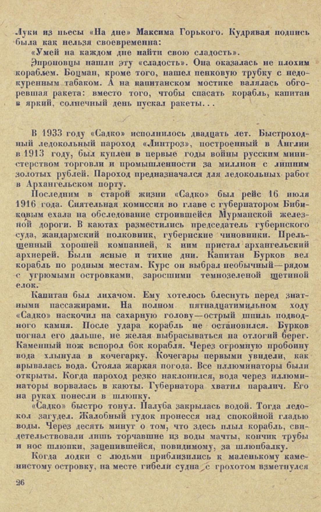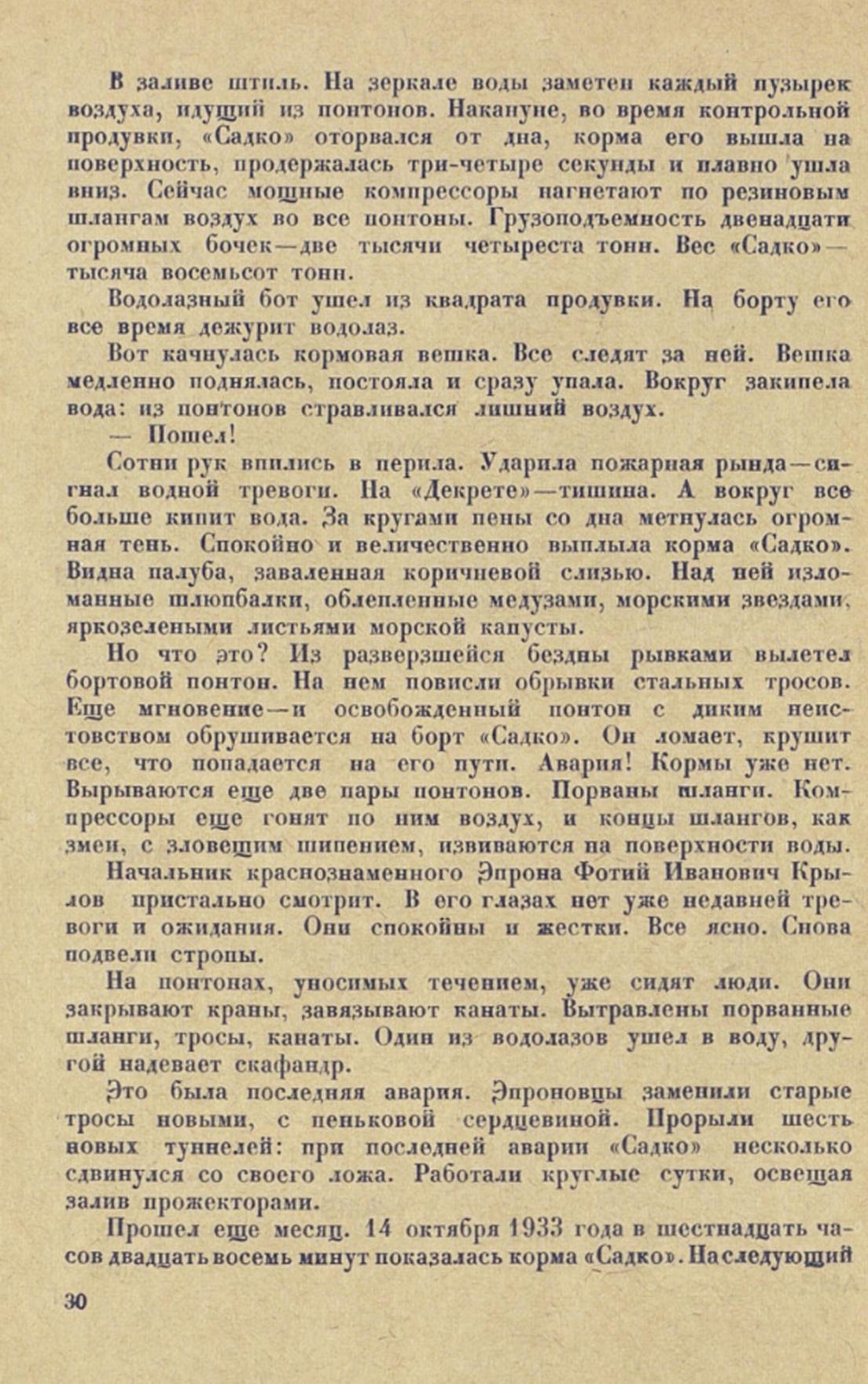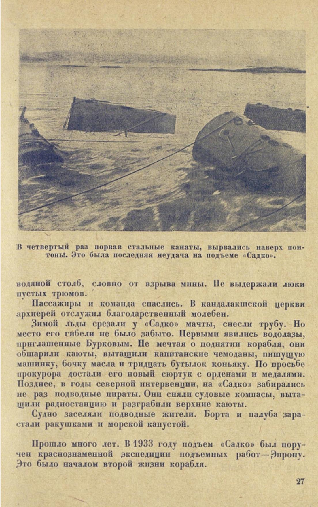 ...Глубокой осенью 1933 года на отмель небольшого островка Богомолиха в Кандалакшской бухте эпроновцы привели ржавую коробку только что поднятого корабля-утопленника. Маленький островок на несколько дней превратился в шумный поселок. Палуба «Садко» очищалась от толстого слоя ракушек, морских звезд, ила, обрывков водорослей. В каютах с потолков свисали гирлянды красных, как кровь, червей и актиний. В трюмах плавала мертвая рыба. Одуряющий, нестерпимо острый запах морского дна витал над островком.