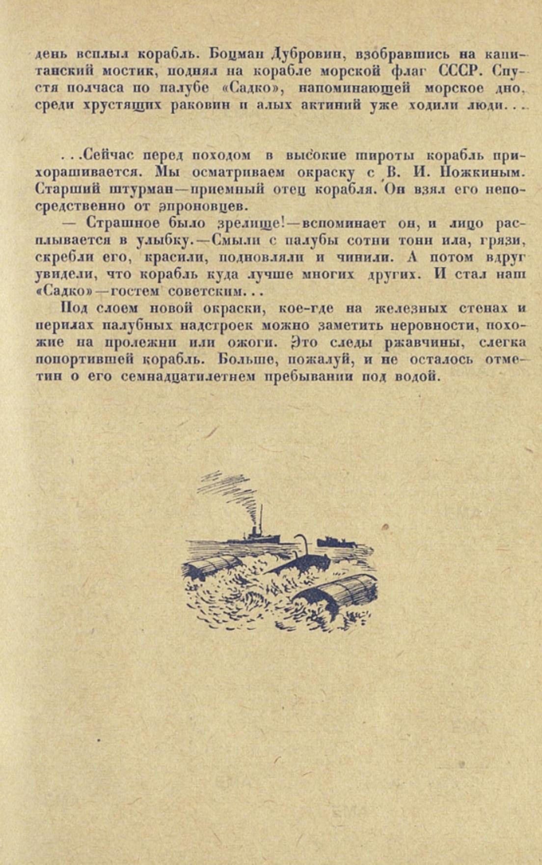 Красавец-корабль, уже до половины погруженный в воду, выжидающе застыл. Распорки еще упирались в его бока. Но стене дока1 флегматично прохаживался старик-докмейстер. К нам доносился напев простенькой песенки. Он мурлыкал ее, равнодушно выбивая один за другим клинья распорок. Старик на своем веку, вероятно, выпустил из дока не одну сотню судов. Стены дока испещрены названиями: немецкими, норвежскими, русскими. Одно из них, написанное белилами, хорошо выделяется: "Садко" 29/VI 1934 г.»