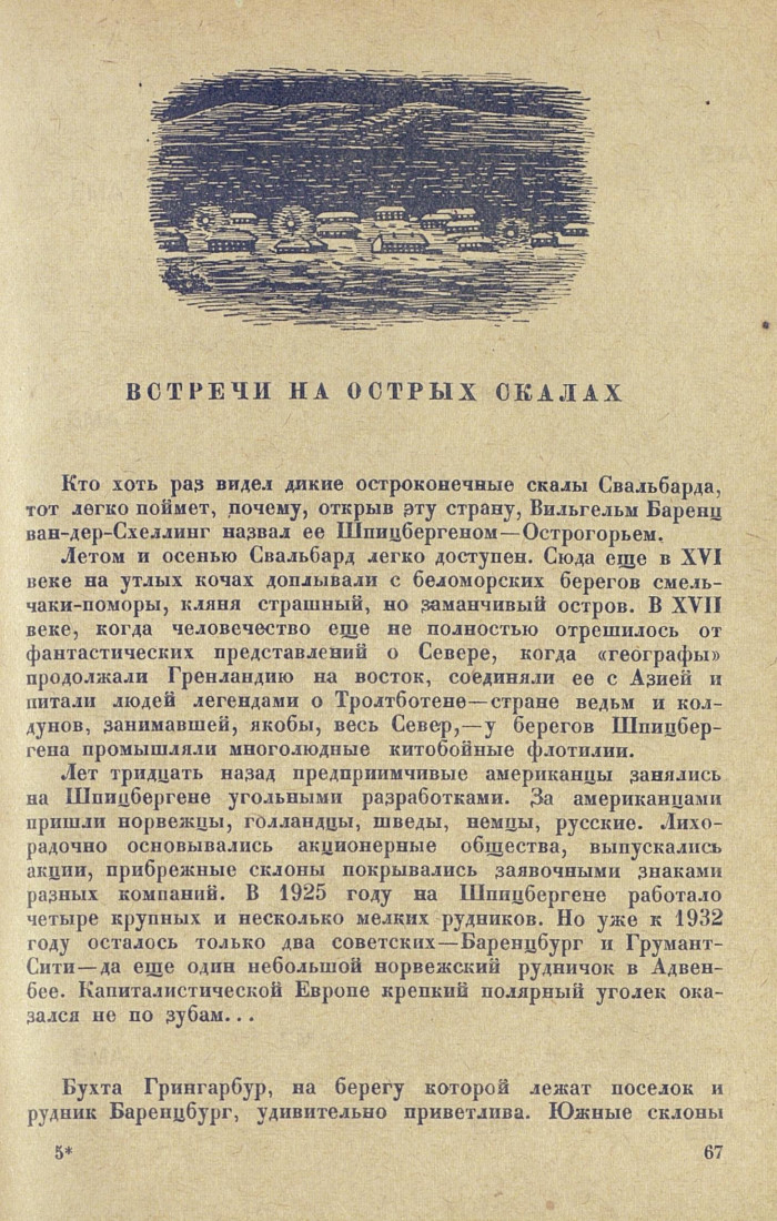 Лет тридцать назад предприимчивые американцы занялись на Шпицбергене угольными разработками. За американцами пришли норвежцы, голландцы, шведы, немцы, русские. Лихорадочно основывались акционерные общества, выпускались акции, прибрежные склоны покрывались заявочными знаками разных компаний. В 1925 году на Шпицбергене работало четыре крупных и несколько мелких рудников. Но уже к 1932 году осталось только два советских — Баренцбург и Грумант-Сити — да еще один небольшой норвежский рудничок в Адвен-бее. Капиталистической Европе крепкий полярный уголек оказался но по зубам...