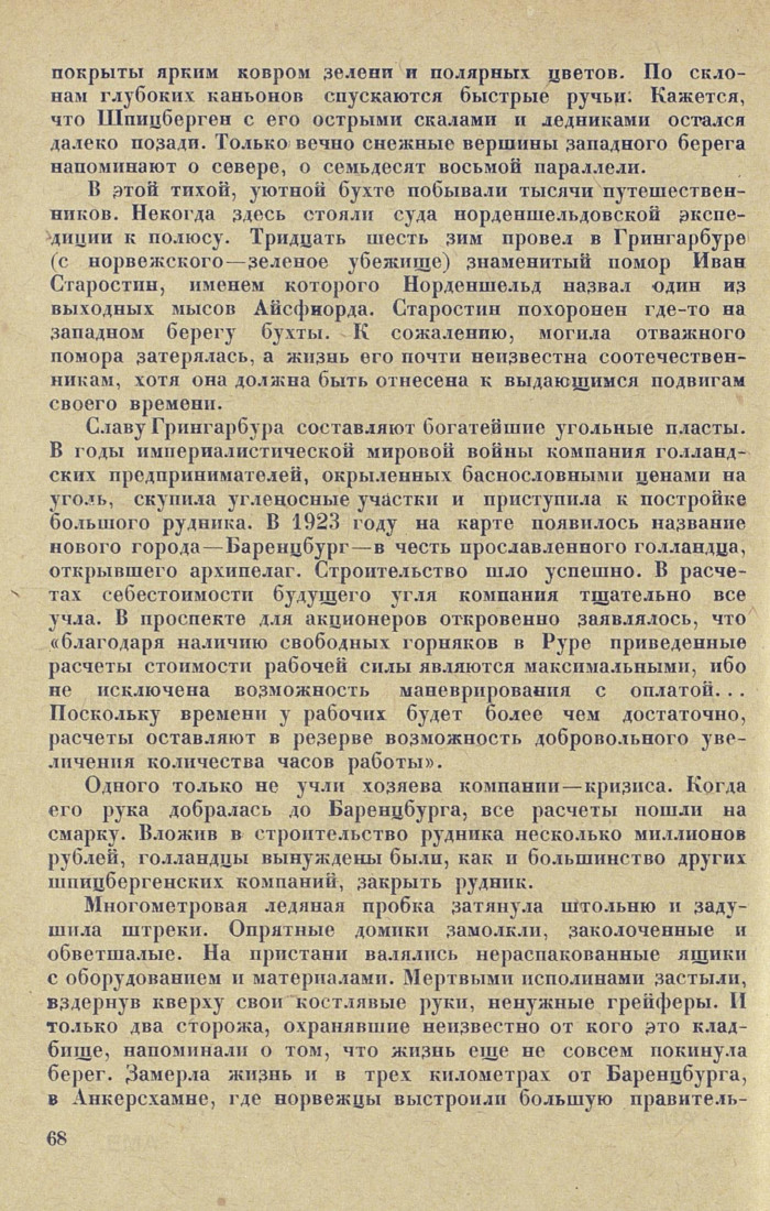 Славу Грингарбура составляют богатейшие угольные пласты. В годы империалистической мировой войны компания голландских предпринимателей, окрыленных баснословными ценами на уголь, скупила угленосные участки и приступила к постройке большого рудника. В 1923 году на карте появилось название нового города — Баренцбург — в честь прославленного голландца, открывшего архипелаг. Строительство шло успешно. В расчетах себестоимости будущего угля компания тщательно все учла. В проспекте для акционеров откровенно заявлялось, что «благодаря наличию свободных горняков в Руре приведенные расчеты стоимости рабочей силы являются максимальными, ибо не исключена возможность маневрирования с оплатой... Поскольку времени у рабочих будет более чем достаточно, расчеты оставляют в резерве возможность добровольного увеличения количества часов работы».