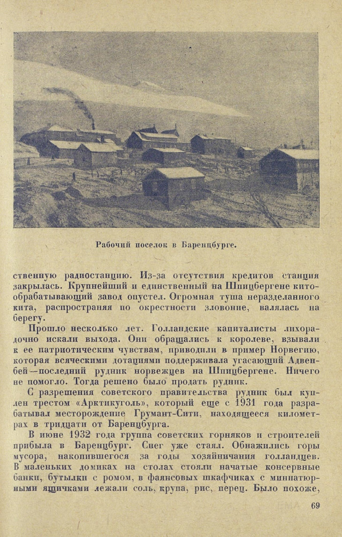 В июне 1932 года группа советских горняков и строителей прибыла в Баренцбург. Снег уже стаял. Обнажились горы мусора, накопившегося за годы хозяйничания голландцев. В маленьких домиках на столах стояли начатые консервные банки, бутылки с ромом, в фаянсовых шкафчиках с миниатюрными ящичками лежали соль, крупа, рис, перец. Было похоже,