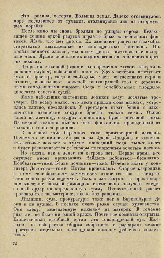 Милиции, суда, прокуратуры тоже нет в Баренцбурге. Да они и пе нужны. В поселке очень редки случаи хулиганства. Они влекут немедленную высылку на материк. В течение ряда лет не было ни одной кражи. Почти все комнаты открыты. Единственный судебный орган — это товарищеский суд. Ежегодно он избирается общим собранием и разбирает мелкие проступки отдельных зимовщиков «именем рабочего коллектива».