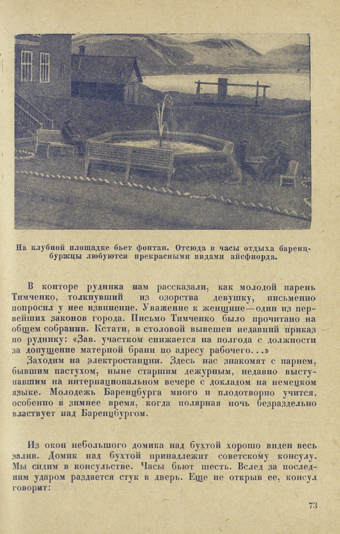 На пристани «Садко» встречал весь город. Мы охотно принимаем приглашение осмотреть шахту, общежития, познакомиться с жизнью заполярной советской колонии. Жители Баренцбурга приехали со всех концов Союза. Донбасс посылает сюда горняков, Москва — механиков, монтеров, Брянск и Рязань — строителей, Ленинград — грузчиков, Архангельск — водников...