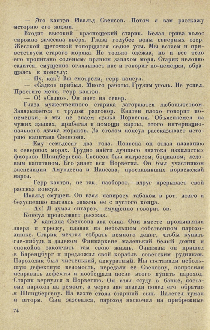 — Ему семьдесят два года. Полвека он отдал плаванию в северных морях. Трудно найти лучшего знатока извилистых фиордов Шпицбергена. Свенсон был матросом, боцманом, ледовым капитаном. Его знает вся Норвегия. Он был участником экспедиции Амундсена и Нансена, прославивших норвежский народ.