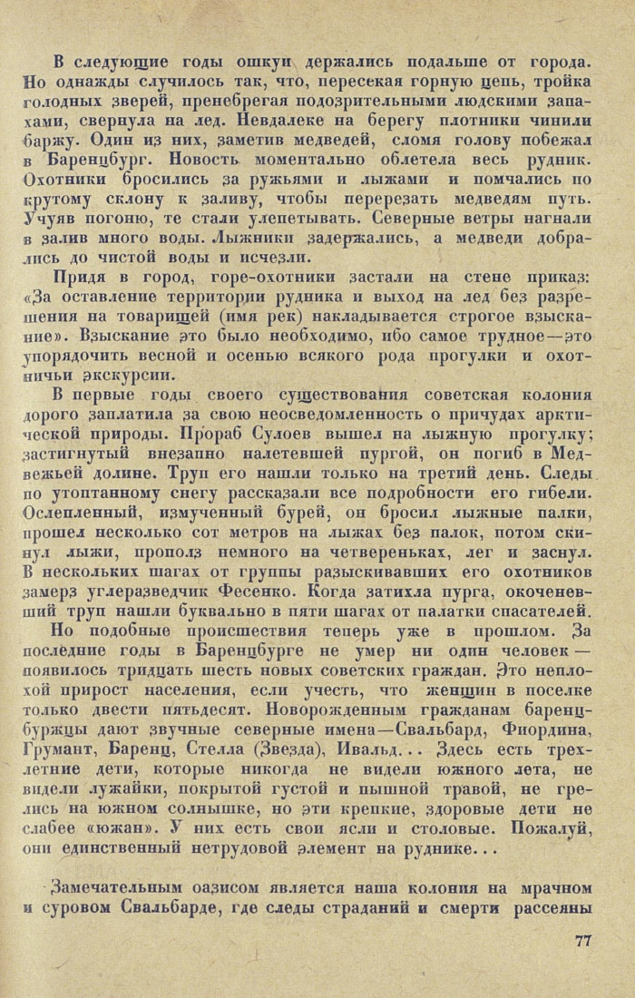Но подобные происшествия теперь уже в прошлом. За последние годы в Баренцбурге не умер ни один человек — появилось тридцать шесть новых советских граждан. Это неплохой прирост населения, если учесть, что женщин в поселке только двести пятьдесят. Новорожденным гражданам баренцбуржцы дают звучные северные имена — Свальбард, Фиордина, Грумант, Баренц, Стелла (Звезда), Ивальд... Здесь есть трехлетние дети, которые никогда не видели южного лета, не видели лужайки, покрытой густой и пышной травой, не грелись на южном солнышке, но эти крепкие, здоровые дети не слабее «южан». У них есть свои ясли и столовые. Пожалуй, они единственный нетрудовой элемент на руднике...