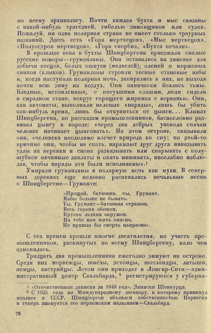 В прошлые века в бухты Шпицбергена приезжали смелые русские поморы — груманланы. Они оставались на зимовке для добычи песцов, белых ошкуев (медведей), оленей и моржовых тинков (клыков). Груманланы строили тесные становые избы и, когда наступала полярная ночь, запирались в них, не выходя почти всю зиму на воздух. Они панически боялись тьмы. Бледные, истомленные, с потухшими глазами, люди сидели в смрадном стане, вокруг горящего жирника с ворванью. Они, как автоматы, выполняли нелепые «наряды», лишь бы убить как-нибудь время, лишь бы откупиться от цынги... Климат Шпицбергена, по рассказам промышленников, баснословно развивал цынгу в народе: «через два добрых уповода спячки человек начинает цынговать». На этом острове, сказывали они, «человека неодолимо влечет природа ко сну; по этой-то причине они, чтобы не спать, наряжют друг друга навязывать узлы на веревки и снова развязывать или спарывать с полушубков овчинные заплаты и опять нашивать, неослабно наблюдая, чтобы наряды эти были исполняемы». 1
