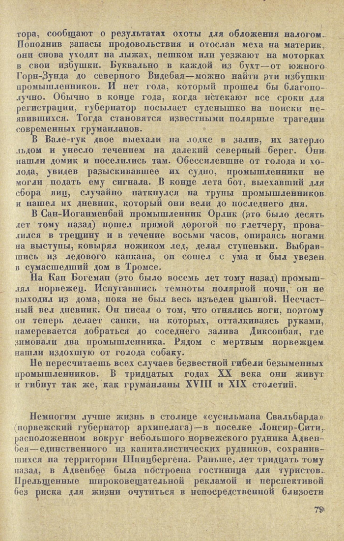 тора, сообщают о результатах охоты для обложения налогом. Пополнив запасы продовольствия и отослав меха на материк, они снова уходят на лыжах, пешком или уезжают на моторках в свои избушки. Буквально в каждой из бухт — от южного Горн-Зунда до северного Видебая — можно найти эти избушки промышленников. И нет года, который прошел бы благополучно. Обычно в конце года, когда истекают все сроки для регистрации, губернатор посылает суденышко на поиски неявившихся. Тогда становятся известными полярные трагедии современных груманланов.