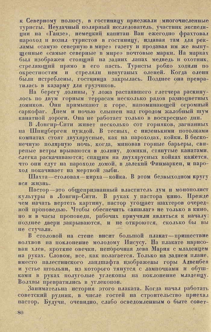 В Лонгир-Сити живет несколько сот горняков, загнанных на Шпицберген нуждой. В тесных, с низенькими потолками комнатах стоят двухярусные, как на пароходах, койки. В бесконечную полярную ночь, когда, миновав горные барьеры, свирепые ветры врываются в долину, домики, стянутые канатами, слегка раскачиваются; спящим на двухярусных койках кажется, что они едут на пароходе домой, в далекий Финмаркен, и пароход покачивает па мертвой зыби.