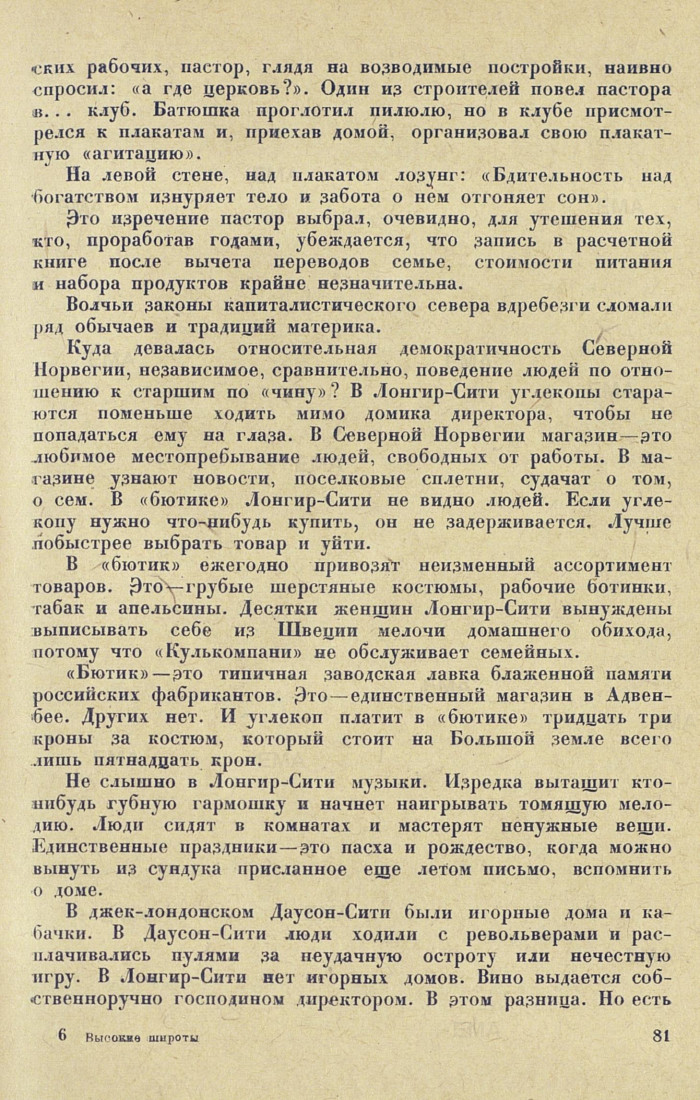 Куда девалась относительная демократичность Северной Норвегии, независимое, сравнительно, поведение людей по отношению к старшим по «чину»? В Лонгир-Сити углекопы стараются поменьше ходить мимо домика директора, чтобы не попадаться ему на глаза. В Северной Норвегии магазин — это любимое местопребывание людей, свободных от работы. В магазине узнают новости, поселковые сплетни, судачат о том, о сем. В «бютике» Лонгир-Сити не видно людей. Если углекопу нужно что-нибудь купить, он не задерживается. Лучше побыстрее выбрать товар и уйти.