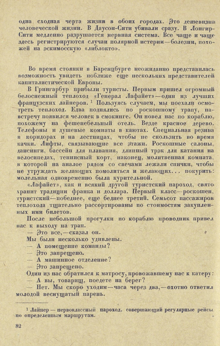 В Грингарбур прибыли туристы. Первым пришел огромный белоснежный теплоход «Генерал Лафайет» — один из лучших французских лайнеров. 1 Пользуясь случаем, мы поехали осмотреть теплоход. Едва поднялись но роскошному трапу, навстречу появился человек в смокинге. Он повел нас но кора6лю, похожему на фешенебельный отель. Везде красное дерево. Телефоны и душевые комнаты в каютах. Специальная резина в коридорах и на лестницах, чтобы не скользить во время качки. Лифты, связывающие все этажи. Роскошные салоны, дансинги, бассейн для плавания, длинный трэк для катания на велосипедах, теннисный корт, наконец, молитвенная комната, в которой на аналое рядом со свечами лежали спички, чтобы не утруждать желающих помолиться и желающих... покурить: молельная одновременно была курительной.