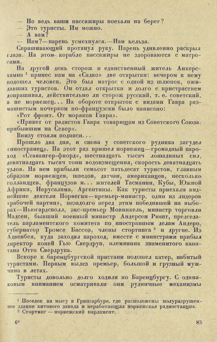 Прошло два дня, и снова у советского рудника загудел «иностранец». На этот раз пришел норвежец — громадный пароход «Сгавангер-фиорд», шестнадцать тысяч лошадиных сил, девятнадцать тысяч тонн водоизмещения, скорость девятнадцать узлов. На нем прибыли семьсот пятьдесят туристов, главным образом норвежцев, шведов, датчан, американцев, несколько голландцев, французов и... жителей Тасмании, Кубы, Южной Африки, Иерусалима, Аргентины. Как туристы приехали виднейшие деятели Норвегии — премьер-министр, один из лидеров «рабочей партии», незадолго перед этим победившей на выборах — Ньюгардсволл, экс-премьер Мовинкель, министр торговли Мадсен, бывший военный министр Андерсен Рюшт, председатель парламентского комитета по иностранным делам Андеро, губернатор Тромсе Бассоэ, члены стортинга 2 и другие. Из Адвенбея, куда заходил пароход, вместе с министрами прибыл директор копей Гью Свердруп, племянник знаменитого капитана Отто Свердрупа.