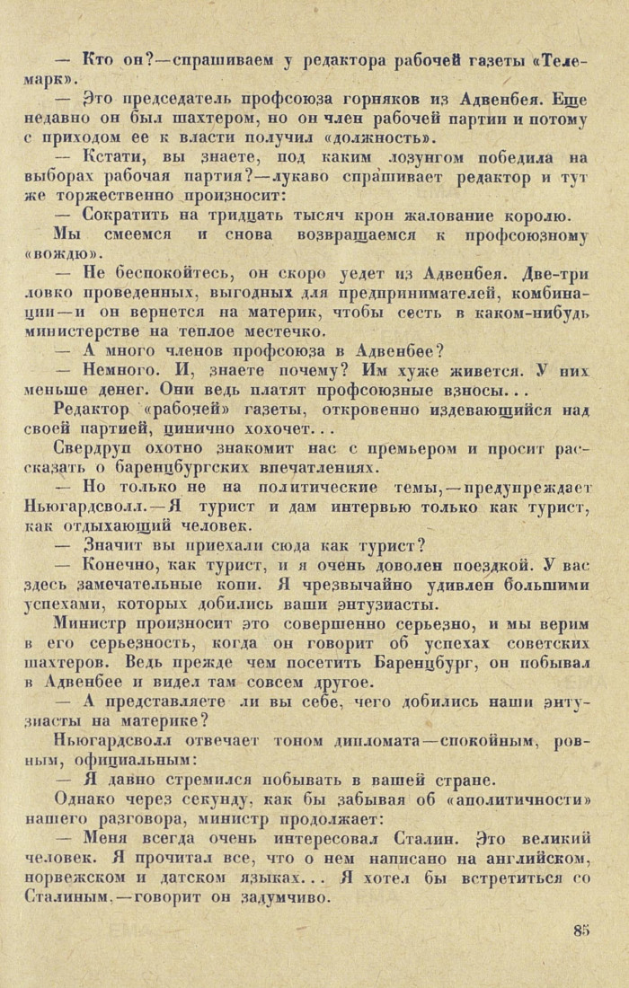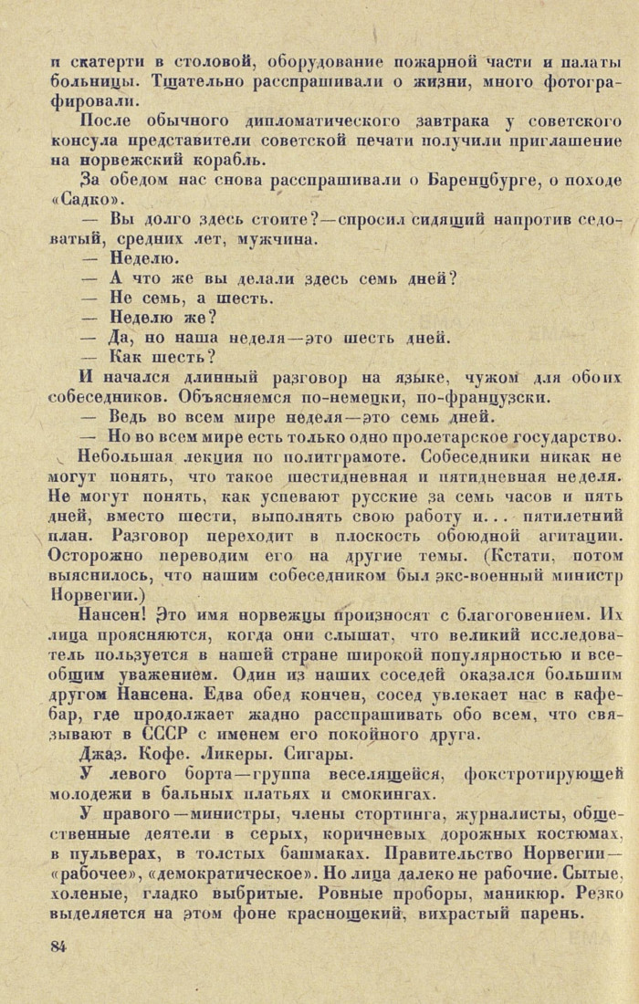 могут понять, что такое шестидневная и пятидневная неделя. Не могут понять, как успевают русские за семь часов и пять дней, вместо шести, выполнять свою работу и... пятилетний план. Разговор переходит в плоскость обоюдной агитации. Осторожно переводим его на другие темы. (Кстати, потом выяснилось, что нашим собеседником был экс-военный министр Норвегии. )