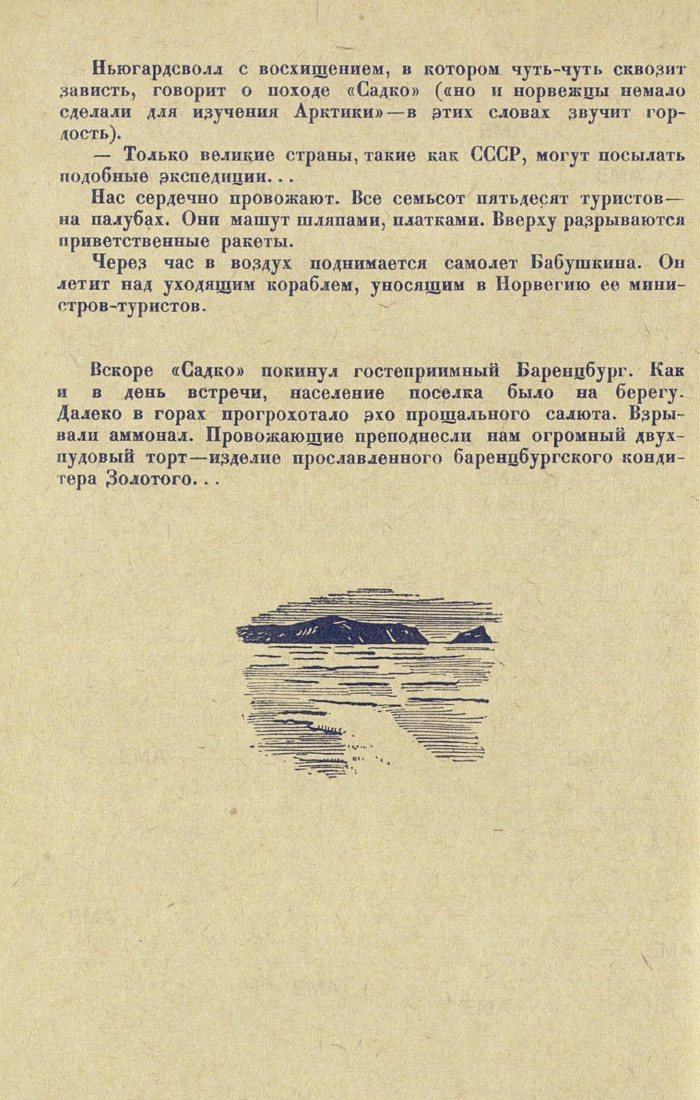Вскоре «Садко» покинул гостеприимный Баренцбург. Как и в день встречи, население поселка было на берегу. Далеко в горах прогрохотало эхо прощального салюта. Взрывали аммонал. Провожающие преподнесли нам огромный двухпудовый торт - изделие прославленного баренцбургского кондитера Золотого...