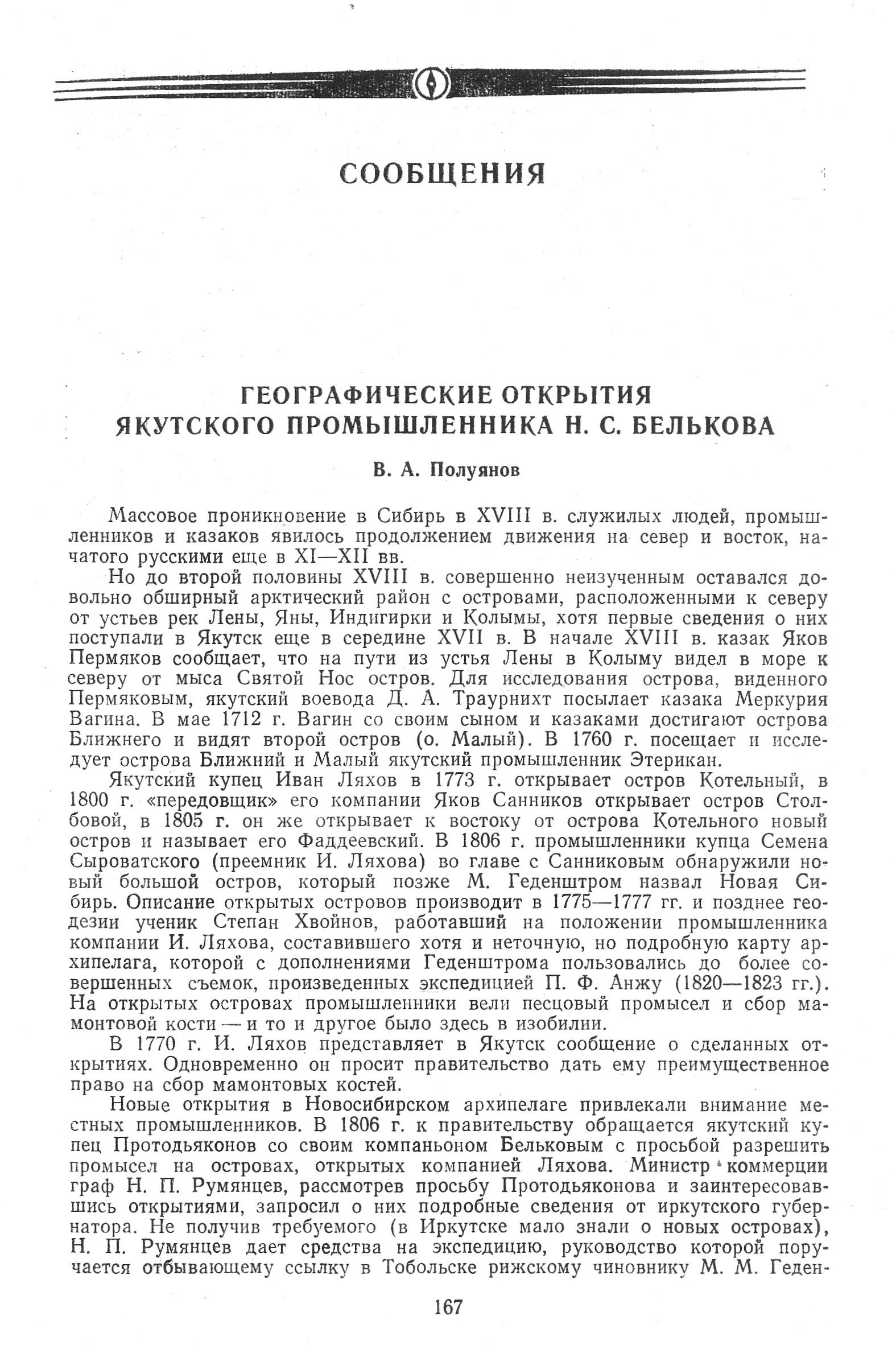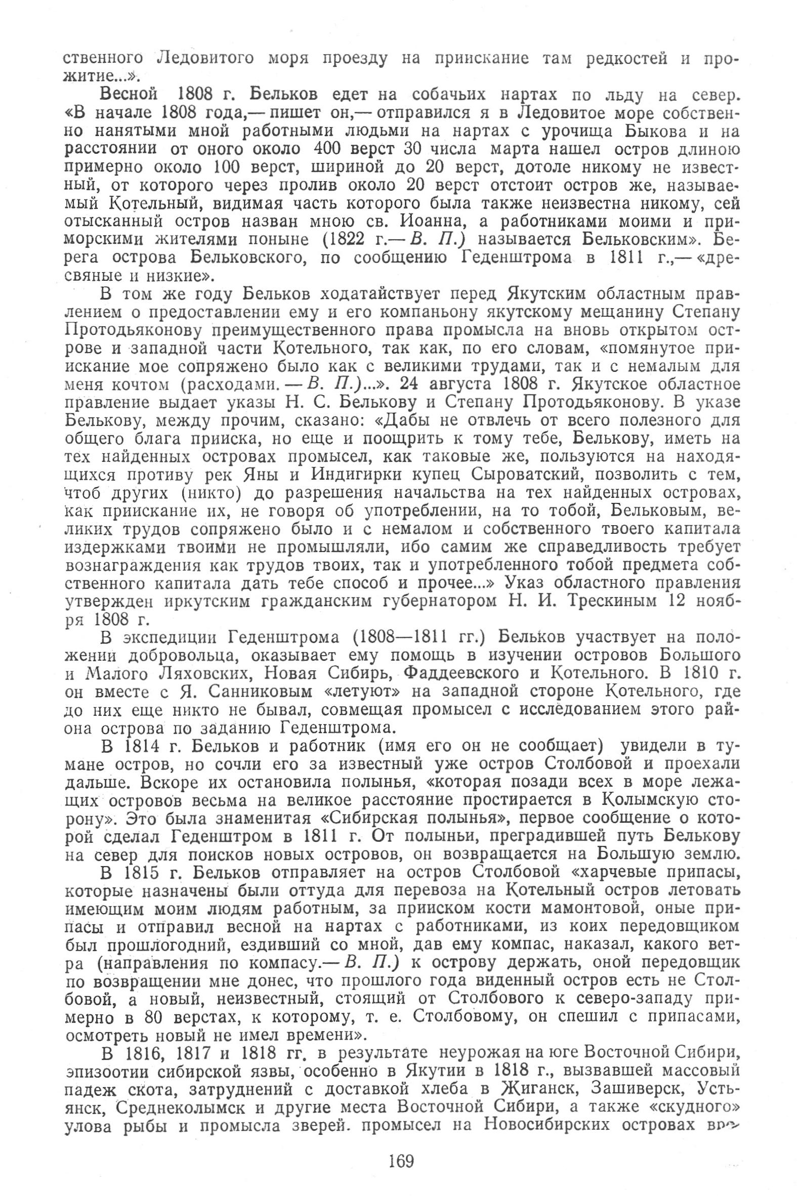 штрому. Прибыв в Устьянск 5 февраля 1809 г., Геденштром устраивает там базу для дальнейшей работы на островах. В это время он встречается со многими якутскими промышленниками и среди них с Н. С. Бельковым, который и сообщает ему об открытии им в 1808 г. к западу от Котельного нового острова. На вновь открытый остров и западную часть острова Котельного Бельков отправляется промышлять летом 1809 г.