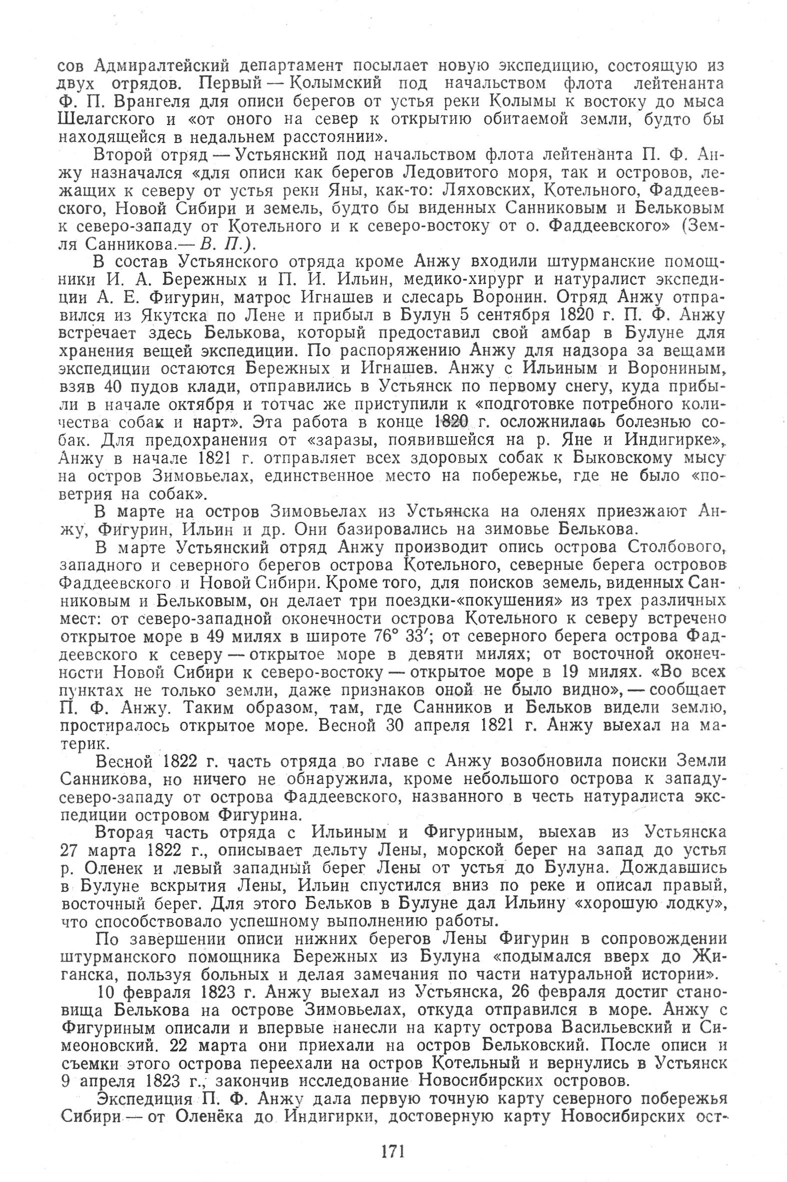 Второй отряд — Устьянский под начальством флота лейтенанта П. Ф. Анжу назначался «для описи как берегов Ледовитого моря, так и островов, лежащих к северу от устья реки Яны, как-то: Ляховских, Котельного, Фаддеевского, Новой Сибири и земель, будто бы виденных Санниковым и Бельковым к северо-западу от Котельного и к северо-востоку от о. Фаддеевского» (Земля Санникова. — В. П.).