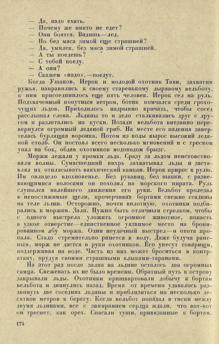 Моржи лежали у кромки льда. Сразу за льдом неистовствовали волны. Сумасшедший вихрь захватывал льды и заставлял их отплясывать вакхический канкан. Иерок прирос к рулю. Им овладело вдохновенье. Без рукавиц, без шапки, с развевающимися волосами он походил на морского пирата. Руль слушался малейшего движения его руки. Вельбот пролезал в непостижимые щели, прочерчивая бортами свежие ссадины на теле льдин. Осторожно, почти вплотную, охотники подбирались к моржам. Залп. Нужно быть отличным стрелком, чтобы с одного выстрела уложить огромное животное, попасть в узкое отверстие — единственное уязвимое место на бронированном лбу моржа. Один неудачный выстрел — и охота пропала. Стадо стремительно ринется в воду. Даже будучи раненым, морж не дастся в руки охотников. Его унесут товарищи, поддерживая па воде. Часть из них может броситься в контратаку, орудуя своими страшными клыками-таранами.
