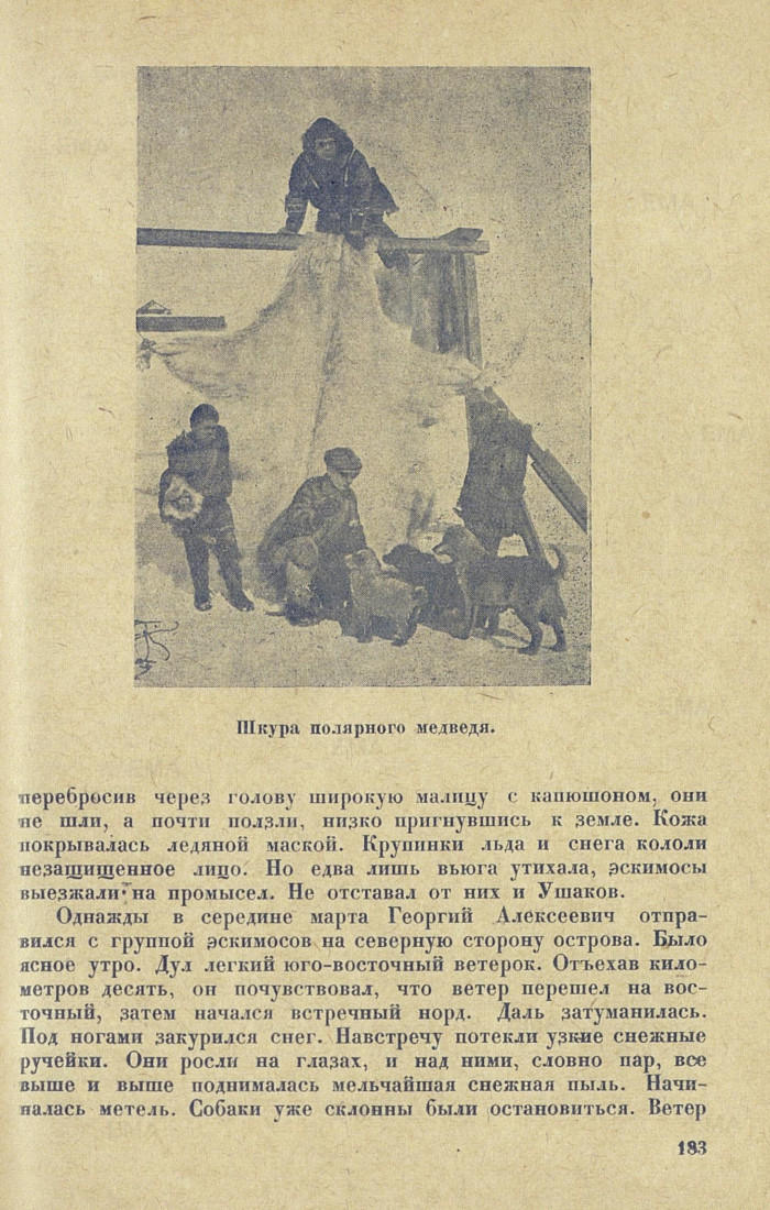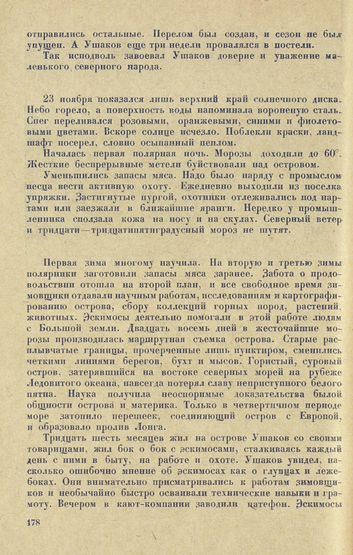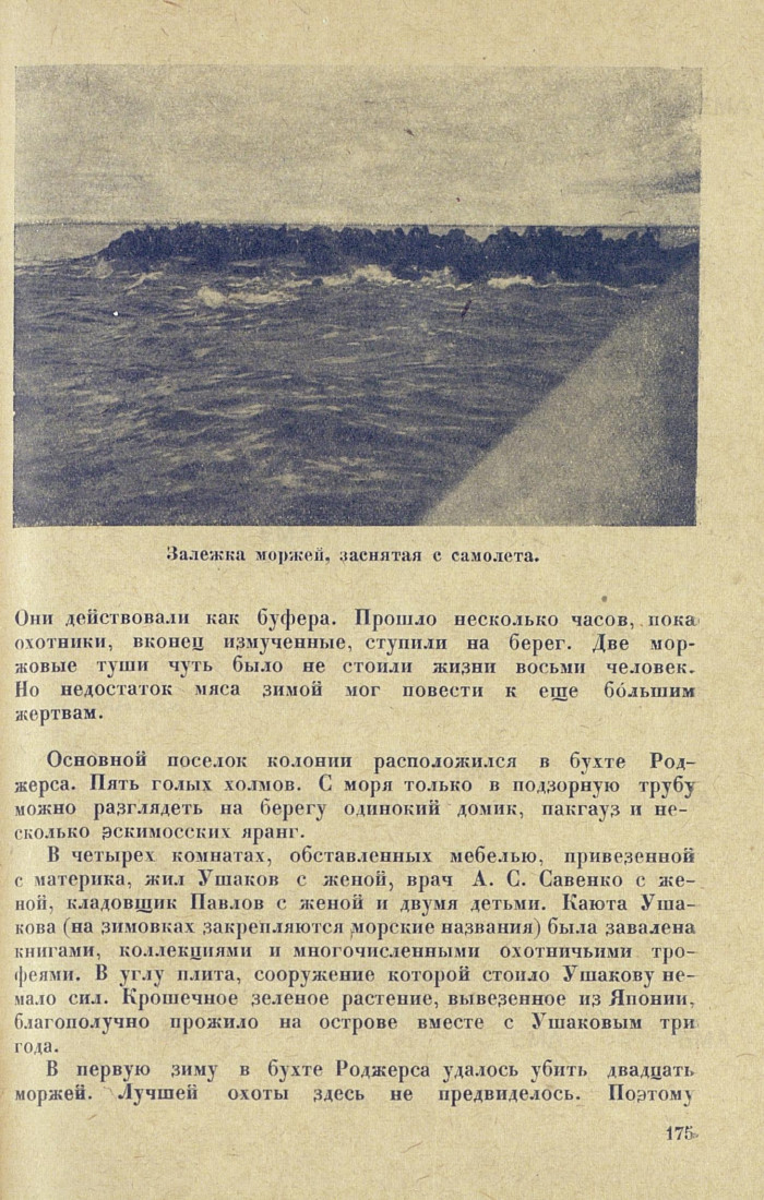 Пришла зима, первая зима полярника Ушакова. Никто из шестидесяти поселенцев не знал острова. Охотников было мало — человек десять. Эскимосы не могли жить без мяса и жира. Сотня собак тоже требовала пищи. На всю долгую полярную зиму надо было заготовить моржовое мясо.