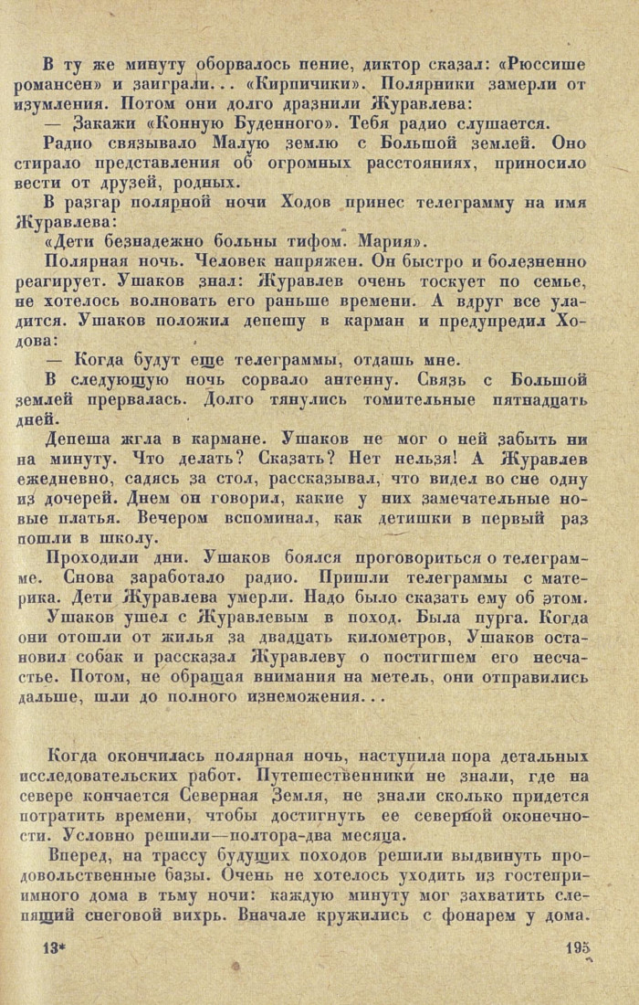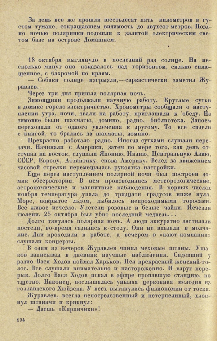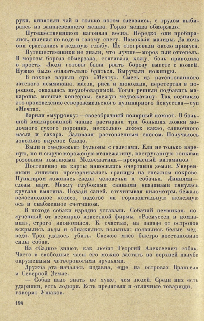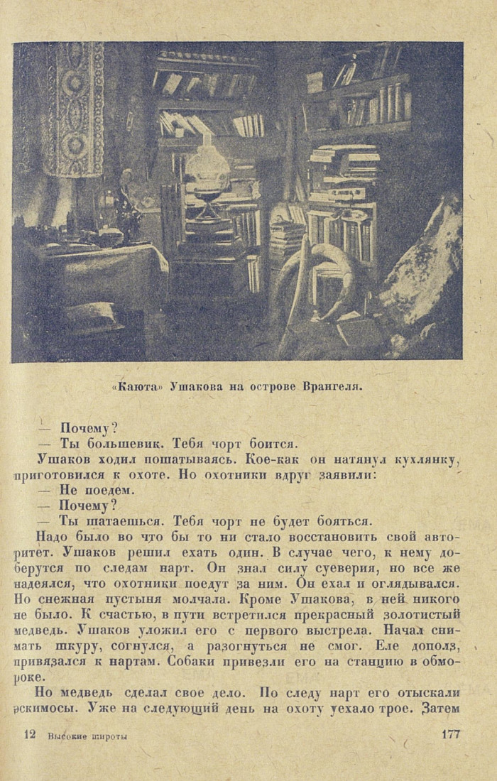 Почти всегда начальника можно видеть ночью бодрствующим. Мы знаем — когда окончится томительная ночная станция. Ушаков придет или на палубу, или в кают-компанию. Правда, иногда подводят книги. Попадись Ушакову не читанный роман Киплинга, Жюль-Верна, Джека Лондона и... увлечется начальник, будет читать всю ночь.