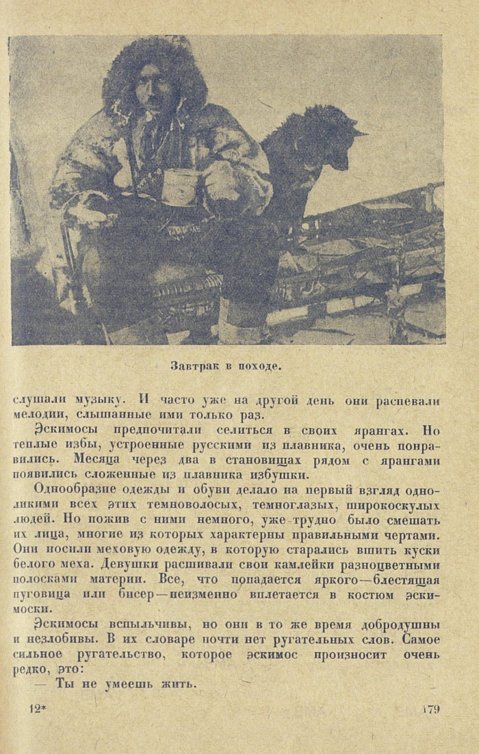 Однообразие одежды и обуви делало на первый взгляд одноликими всех этих темноволосых, темноглазых, широкоскулых людей. Но пожив с ними немного, уже трудно было смешать их лица, многие из которых характерны правильными чертами. Они носили меховую одежду, в которую старались вшить куски белого меха. Девушки расшивали свои камлейки разноцветными полосками материи. Все, что попадается яркого — блестящая пуговица или бисер — неизменно вплетается в костюм эскимоски.