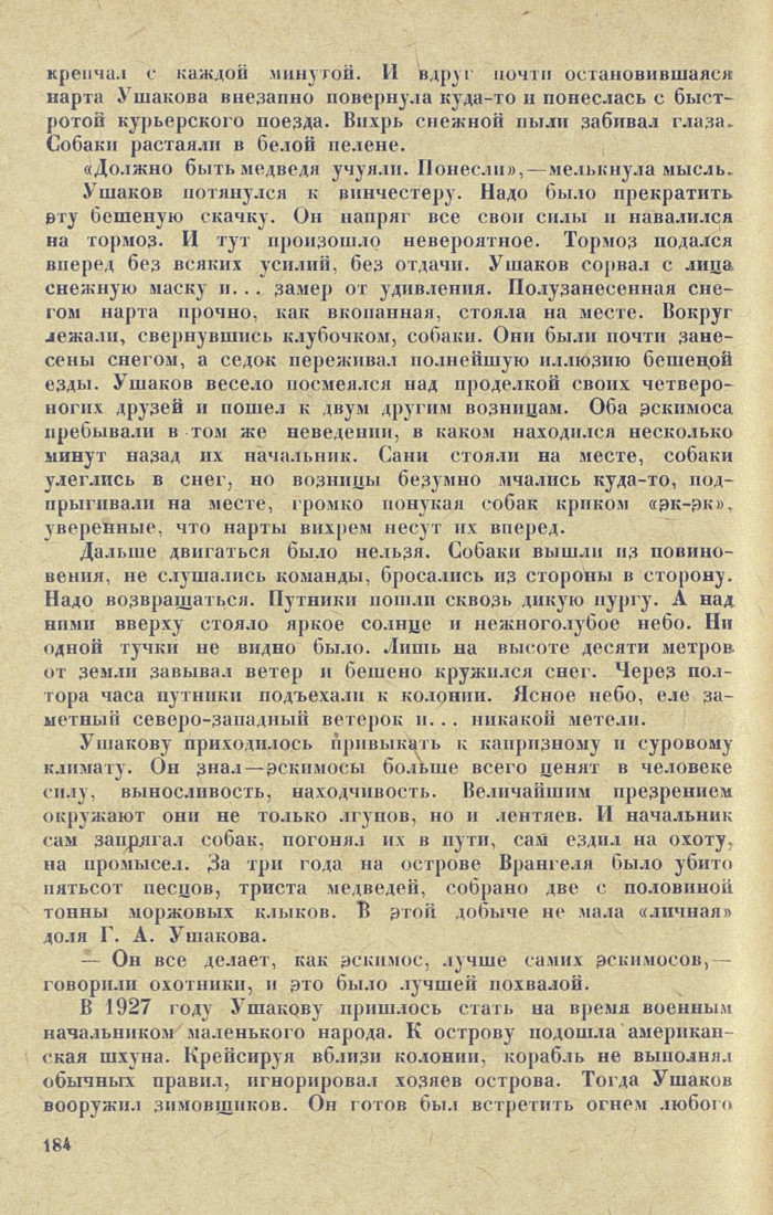 Но снежная пустыня молчала. Кроме Ушакова, в ней никого не было. К счастью, в пути встретился прекрасный золотистый медведь. Ушаков уложил его с первого выстрела. Начал снимать шкуру, согнулся, а разогнуться не смог. Еле дополз, привязался к нартам. Собаки привезли его на станцию в обмороке.