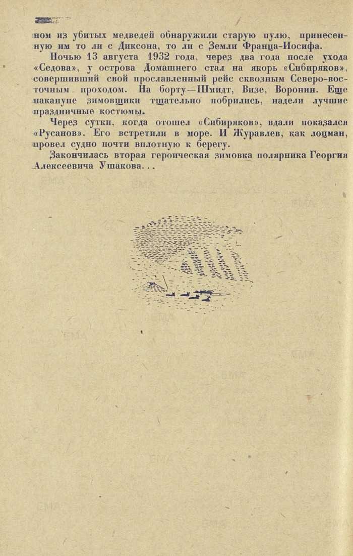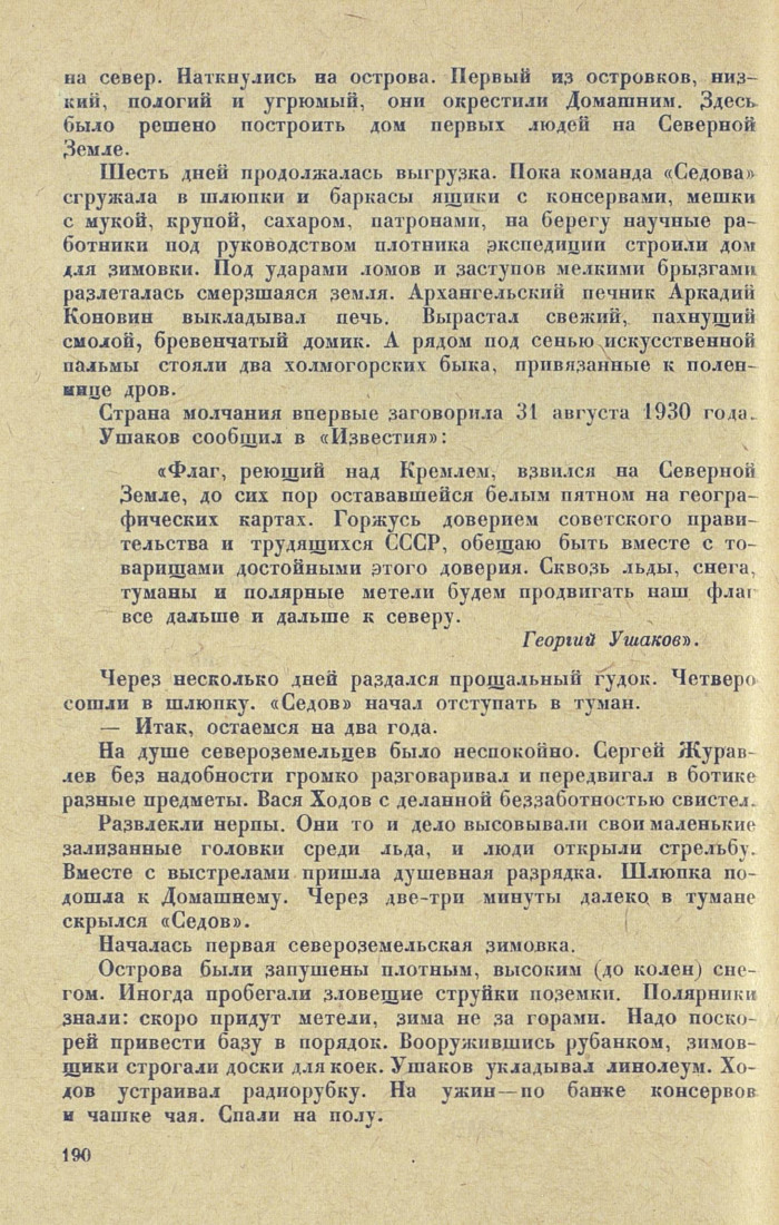 Прошло еще два года. Советское правительство решило организовать на этом богатом пушниной и зверьем острове полярную станцию, которая начала бы освоение природных богатств и научные наблюдения. Начальником острова назначен Ушаков, молодой коммунист, работник дальневосточного Госторга, питомец старой амурской казачьей семьи.