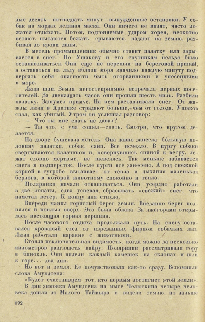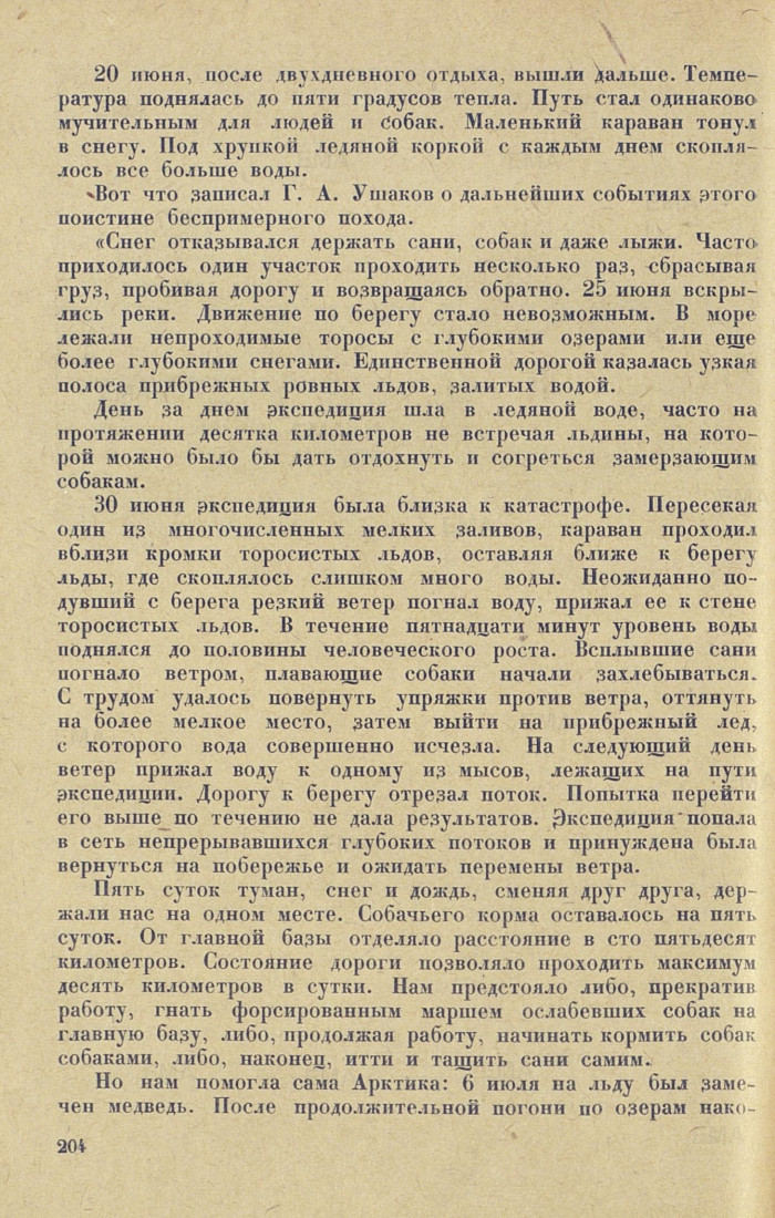 «Снег отказывался держать сани, собак и даже лыжи. Часто приходилось один участок проходить несколько раз, сбрасывая груз, пробивая дорогу и возвращаясь обратно. 25 июня вскрылись реки. Движение но берегу стало невозможным. В море лежали непроходимые торосы с глубокими озерами или еще более глубокими снегами. Единственной дорогой казалась узкая полоса прибрежных ровных льдов, залитых водой.