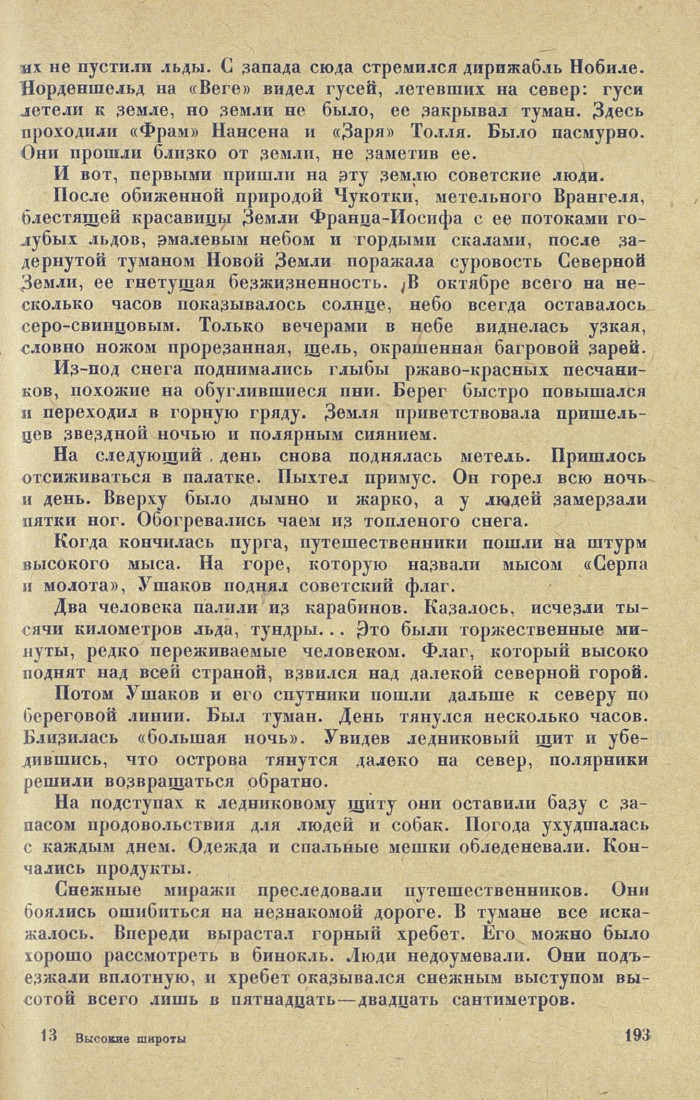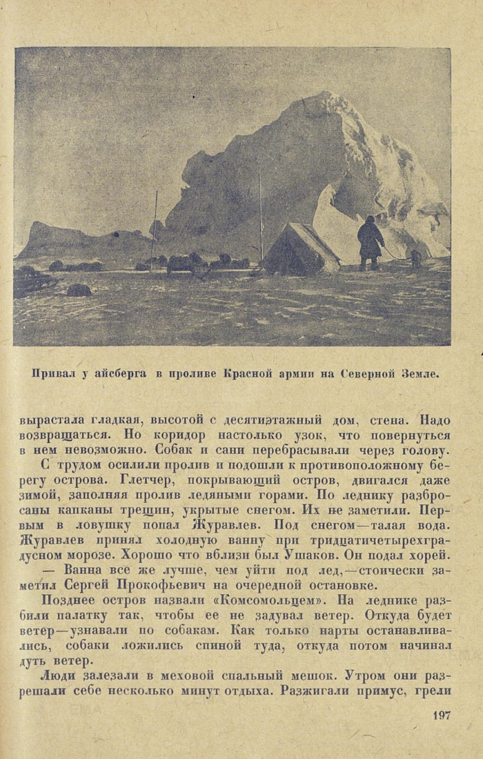 Первомайский праздник они встречали на острове Комсомолец на берегу пролива Красной армии. 1 Мая! В такие дни особенно чувствуешь отрыв от родины, от близких и друзей. Над льдами и снегами часто поднимался розовый туман. Заря вставала, точно отблеск знамен с далекой Красной площади.