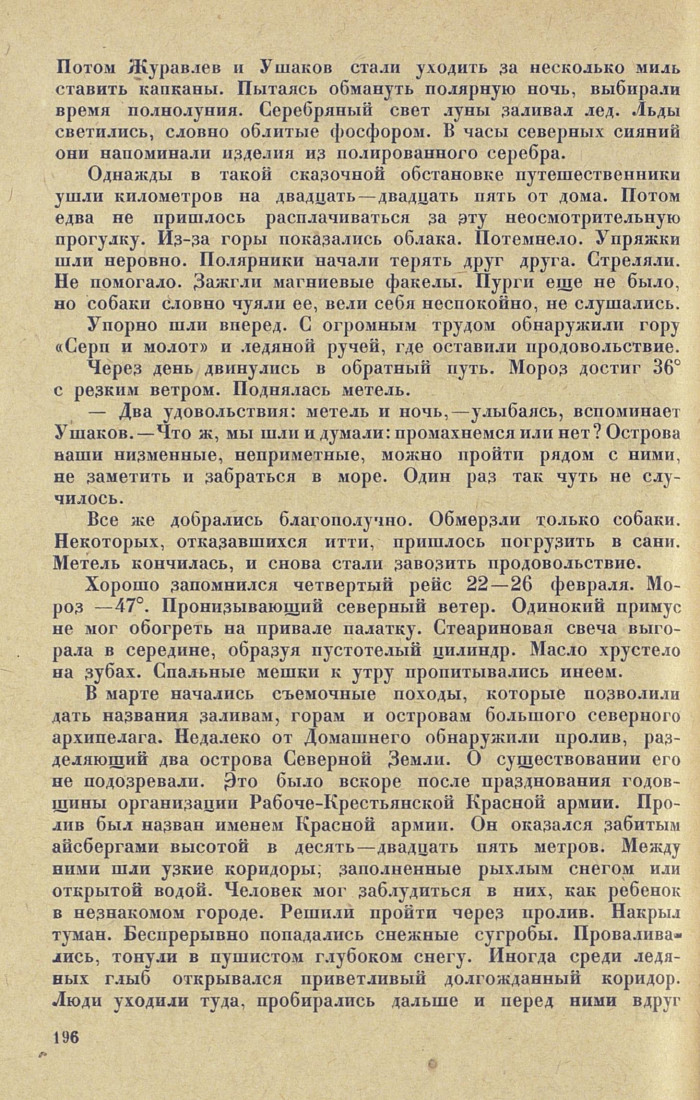 Хорошо запомнился четвертый рейс 22—26 февраля. Мороз —47°. Пронизывающий северный ветер. Одинокий примус не мог обогреть на привале палатку. Стеариновая свеча выгорала в середине, образуя пустотелый цилиндр. Масло хрустело на зубах. Спальные мешки к утру пропитывались инеем.