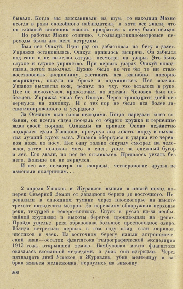 За Османом шла слава нелюдима. Когда нарезали мясо собакам, он всегда сидел поодаль от общего кружка и терпеливо ждал своей порции. Однажды на привале Осман незаметно подкрался сзади Ушакова, просунул под локоть морду и выхватил лучший кусок мяса. Ушаков обернулся и ударил его черепком ножа но носу. Пес одну только секунду смотрел на человека, затем положил мясо в снег, ушел за снежный бугор и лег. Его звали, но пес не откликался. Пришлось уехать без него. Больше он не вернулся.