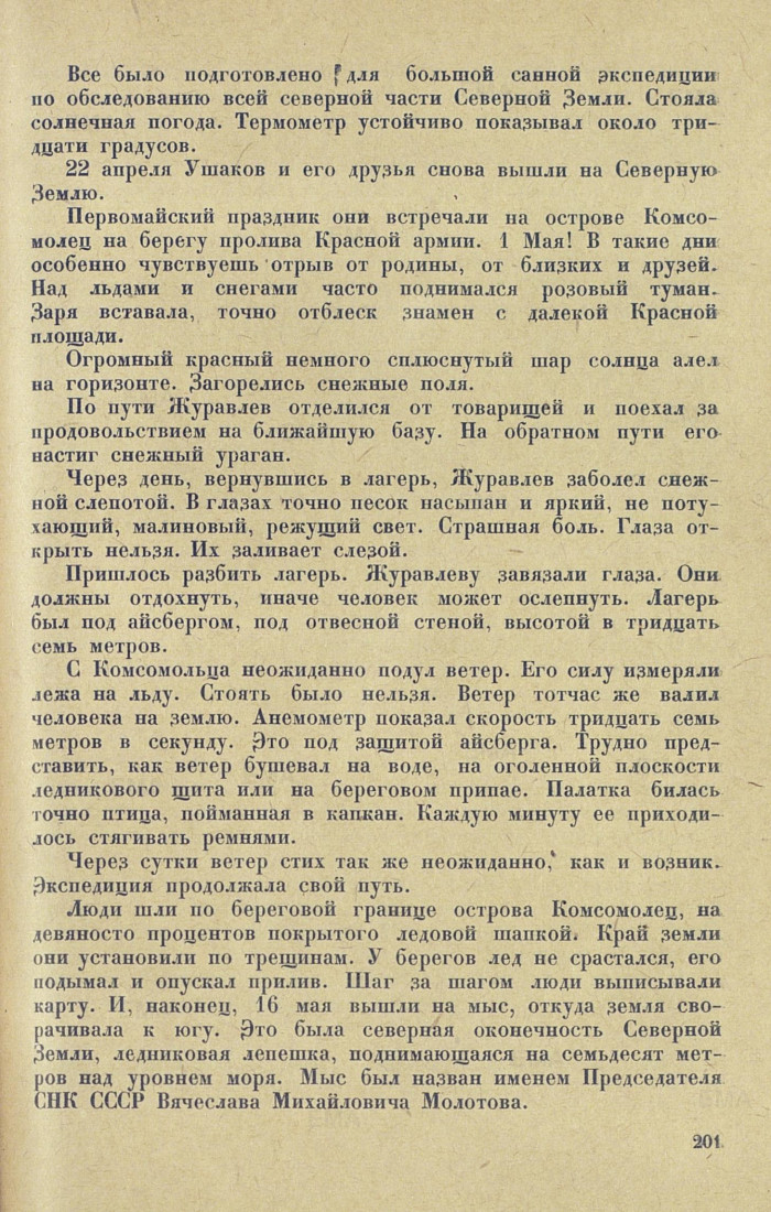 Люди шли по береговой границе острова Комсомолец, на девяносто процентов покрытого ледовой шапкой. Край земли они установили по трещинам. У берегов лед не срастался, его подымал и опускал прилив. Шаг за шагом люди выписывали карту. И, наконец, 16 мая вышли на мыс, откуда земля сворачивала к югу. Это была северная оконечность Северной Земли, ледниковая лепешка, поднимающаяся на семьдесят метров над уровнем моря. Мыс был назван именем Председателя СНК СССР Вячеслава Михайловича Молотова.