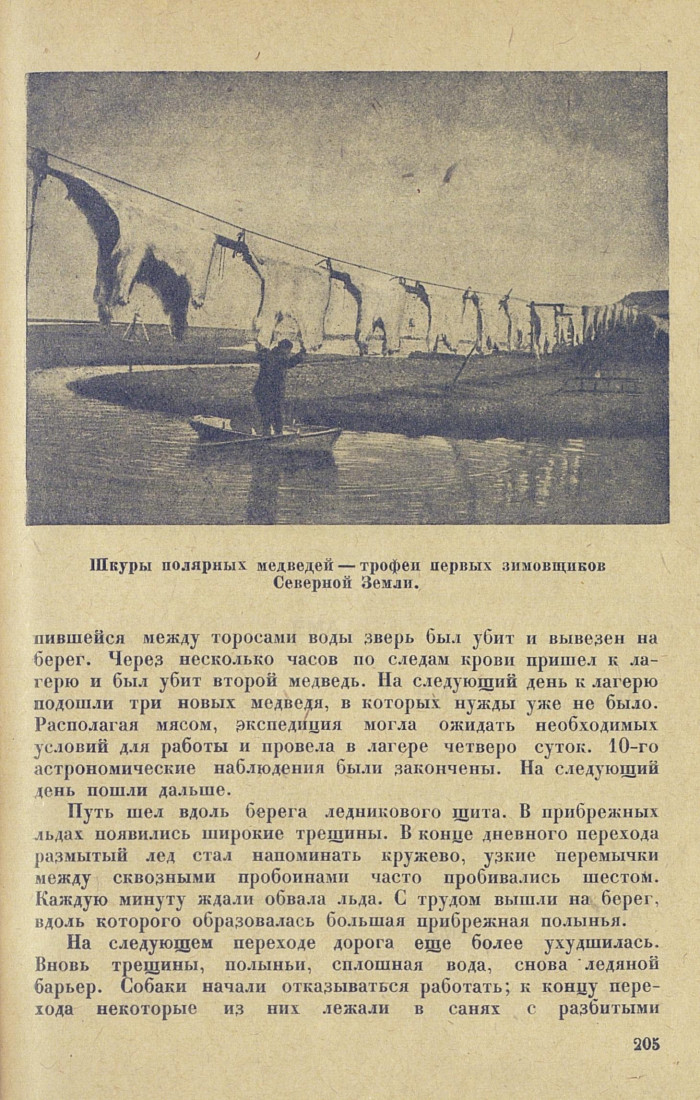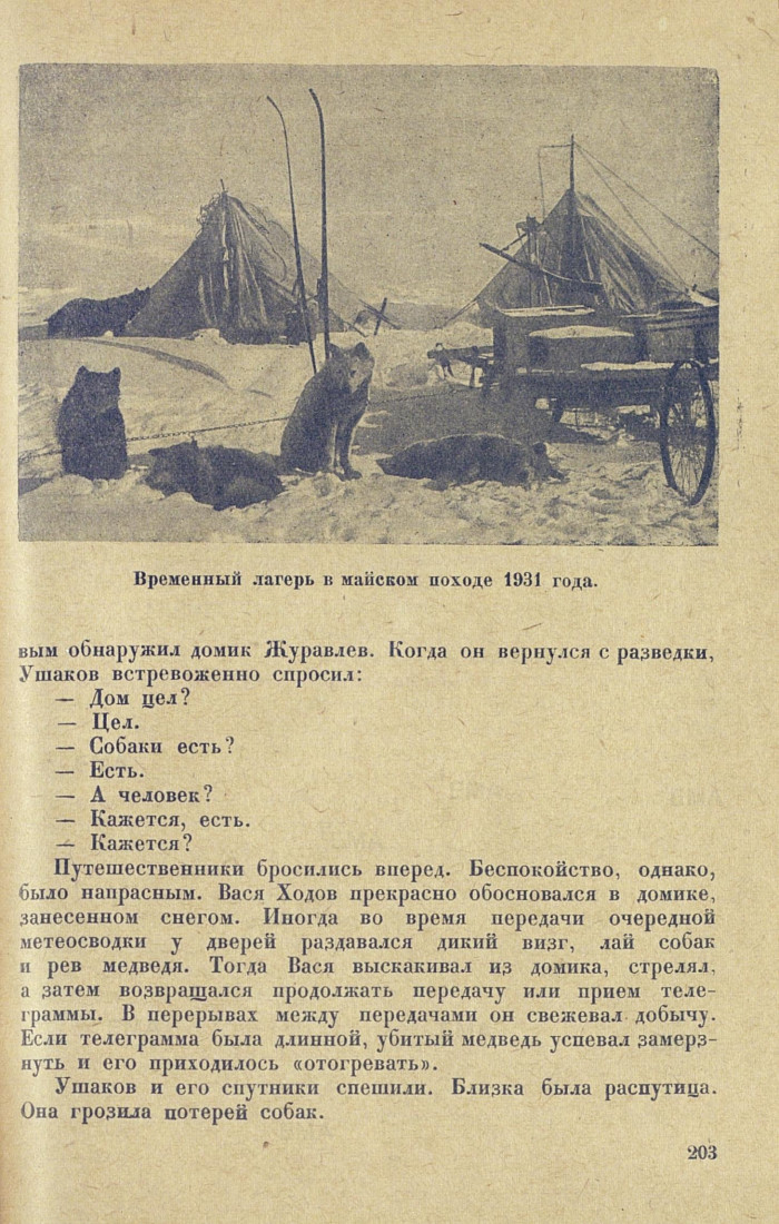 Путешественники бросились вперед. Беспокойство, однако, было напрасным. Вася Ходов прекрасно обосновался в домике, занесенном снегом. Иногда во время передачи очередной метеосводки у дверей раздавался дикий визг, лай собак и рев медведя. Тогда Вася выскакивал из домика, стрелял, а затем возвращался продолжать передачу или прием телеграммы. В перерывах между передачами он свежевал добычу. Если телеграмма была длинной, убитый медведь успевал замерзнуть и его приходилось «отогревать».