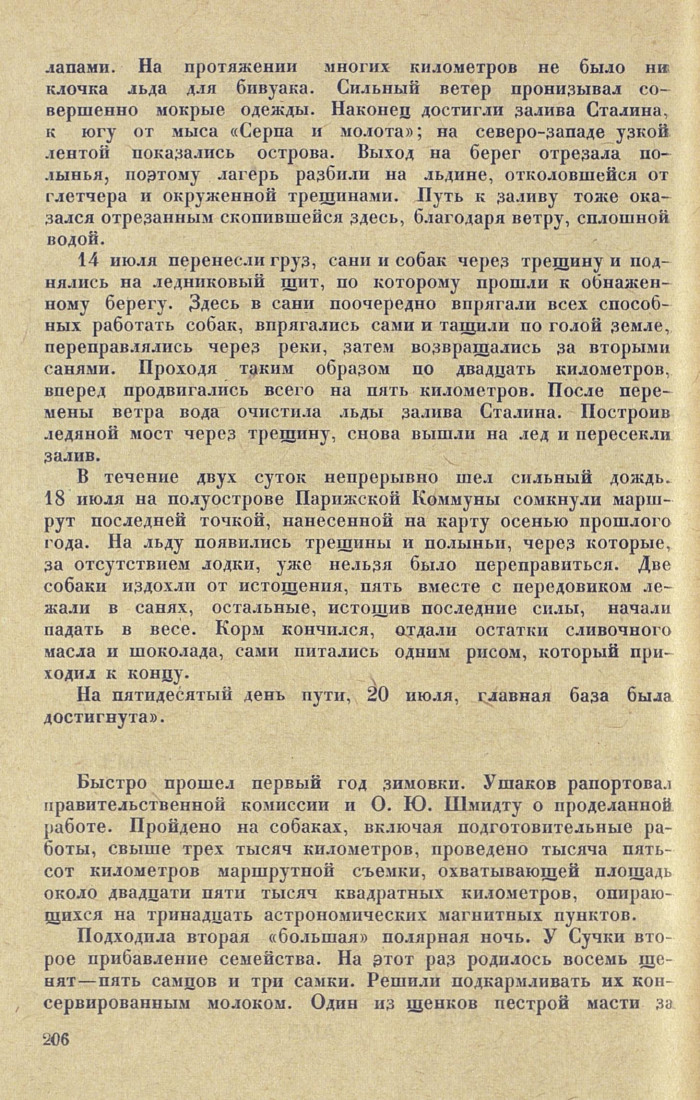 лапами. На протяжении многих километров не было ни клочка льда для бивуака. Сильный ветер пронизывал совершенно мокрые одежды. Наконец достигли залива Сталина, к югу от мыса «Серпа и молота»; на северо-западе узкой лентой показались острова. Выход на берег отрезала полынья, поэтому лагерь разбили на льдине, отколовшейся от глетчера и окруженной трещинами. Путь к заливу тоже оказался отрезанным скопившейся здесь, благодаря ветру, сплошной водой.