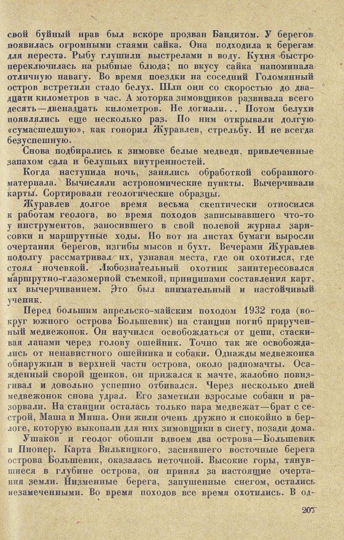 свой буйный нрав был вскоре прозван Бандитом. У берегов появилась огромными стаями сайка. Она подходила к берегам для нереста. Рыбу глушили выстрелами в воду. Кухня быстро переключилась на рыбные блюда; по вкусу сайка напоминала отличную навагу. Во время поездки на соседний Голомянный остров встретили стадо белух. Шли они со скоростью до двадцати километров в час. А моторка зимовщиков развивала всего десять — двенадцать километров. Не догнали... Потом белухи появлялись еще несколько раз. По ним открывали долгую «сумасшедшую», как говорил Журавлев, стрельбу. И не всегда безуспешную.