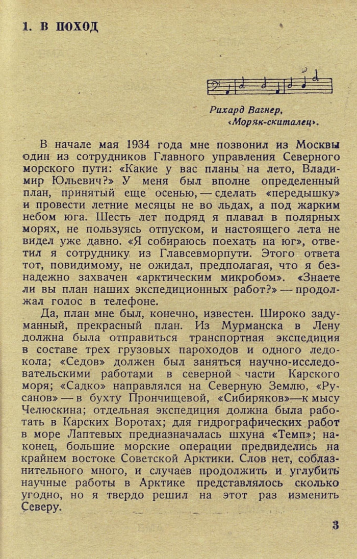В начале мая 1934 года мне позвонил из Москвы один из сотрудников Главного управления Северного морского пути: «Какие у вас планы на лето, Владимир Юльевич?» У меня был вполне определенный план, принятый еще осенью, — сделать «передышку» и провести летние месяцы не во льдах, а под жарким небом юга. Шесть лет подряд я плавал в полярных морях, не пользуясь отпуском, и настоящего лета не видел уже давно. «Я собираюсь поехать на юг», ответил я сотруднику из Главсевморпути. Этого ответа тот, повидимому, не ожидал, предполагая, что я безнадежно захвачен «арктическим микробом». «Знаете ли вы план наших экспедиционных работ?» — продолжал голос в телефоне.