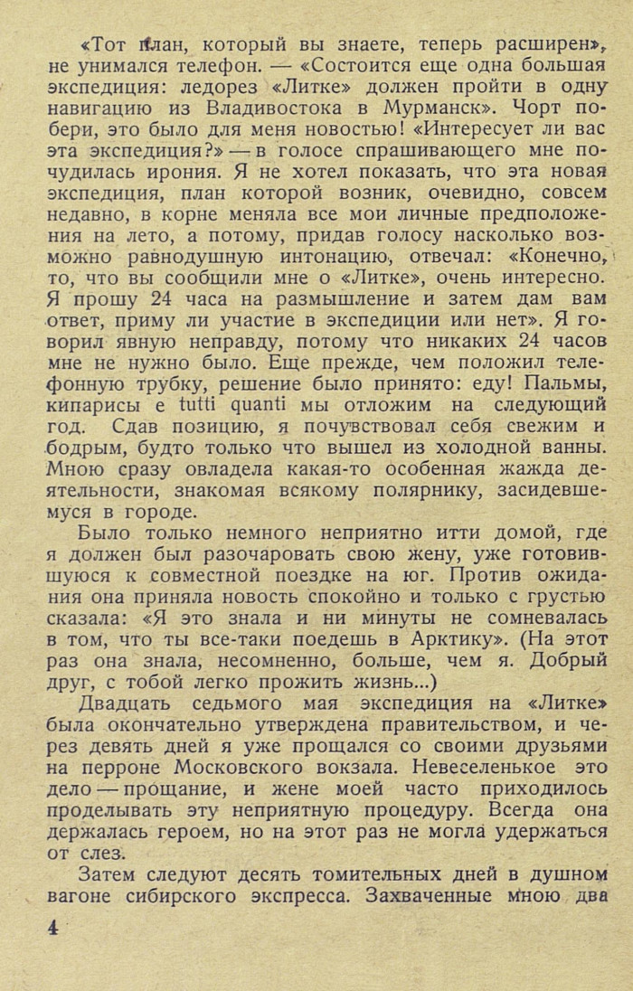 «Тот план, который вы знаете, теперь расширен», не унимался телефон. — «Состоится еще одна большая экспедиция: ледорез «Литке» должен пройти в одну навигацию из Владивостока в Мурманск». Чорт побери, это было для меня новостью! «Интересует ли вас эта экспедиция?» — в голосе спрашивающего мне почудилась ирония. Я не хотел показать, что эта новая экспедиция, план которой возник, очевидно, совсем недавно, в корне меняла все мои личные предположения на лето, а потому, придав голосу насколько возможно равнодушную интонацию, отвечал: «Конечно, то, что вы сообщили мне о «Литке», очень интересно. Я прошу 24 часа на размышление и затем дам вам ответ, приму ли участие в экспедиции или нет». Я говорил явную неправду, потому что никаких 24 часов мне не нужно было. Еще прежде, чем положил телефонную трубку, решение было принято: еду! Пальмы, кипарисы e tutti quanti мы отложим на следующий год. Сдав позицию, я почувствовал себя свежим и бодрым, будто только что вышел из холодной ванны. Мною сразу овладела какая-то особенная жажда деятельности, знакомая всякому полярнику, засидевшемуся в городе.
