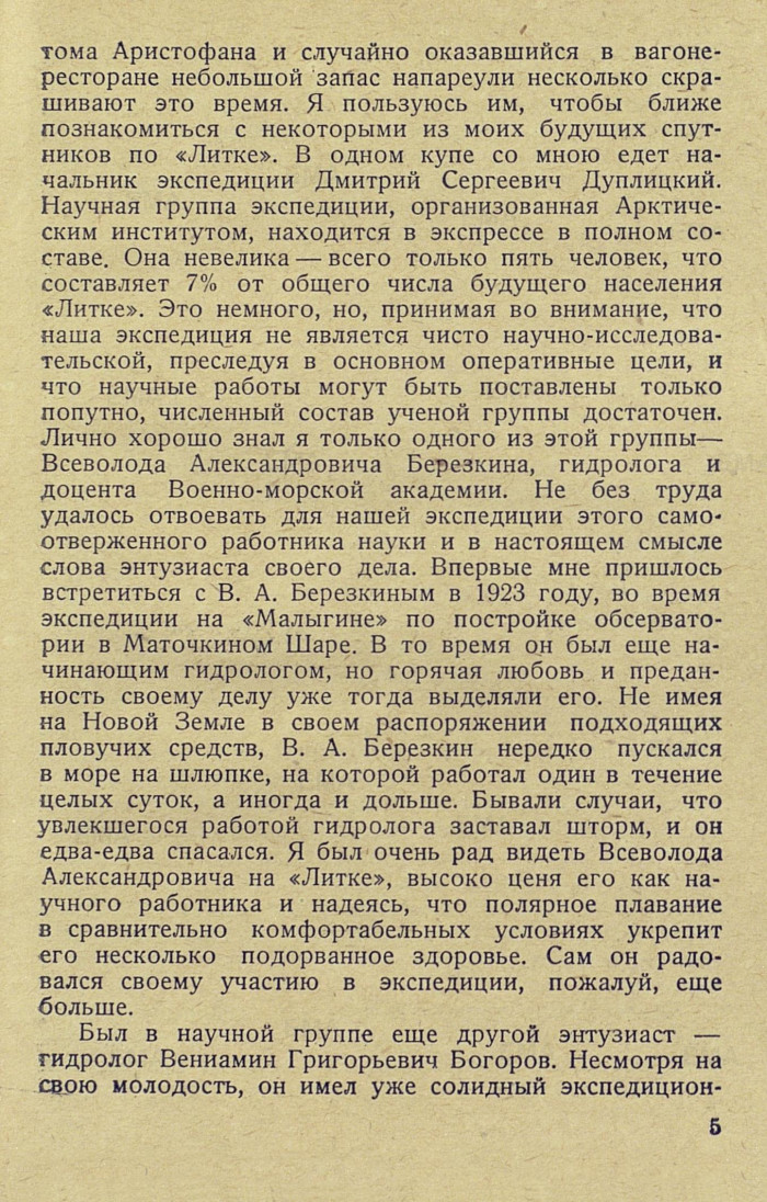 Всеволода Александровича Березкина, гидролога и доцента Военно-морской академии. Не без труда удалось отвоевать для нашей экспедиции этого самоотверженного работника науки и в настоящем смысле слова энтузиаста своего дела. Впервые мне пришлось встретиться с В. А. Березкиным в 1923 году, во время экспедиции на «Малыгине» по постройке обсерватории в Маточкином Шаре. В то время он был еще начинающим гидрологом, но горячая любовь и преданность своему делу уже тогда выделяли его. Не имея на Новой Земле в своем распоряжении подходящих пловучих средств, В. А. Березкин нередко пускался в море на шлюпке, на которой работал один в течение целых суток, а иногда и дольше. Бывали случаи, что увлекшегося работой гидролога заставал шторм, и он едва-едва спасался. Я был очень рад видеть Всеволода Александровича на «Литке», высоко ценя его как научного работника и надеясь, что полярное плавание в сравнительно комфортабельных условиях укрепит его несколько подорванное здоровье. Сам он радовался своему участию в экспедиции, пожалуй, еще больше.
