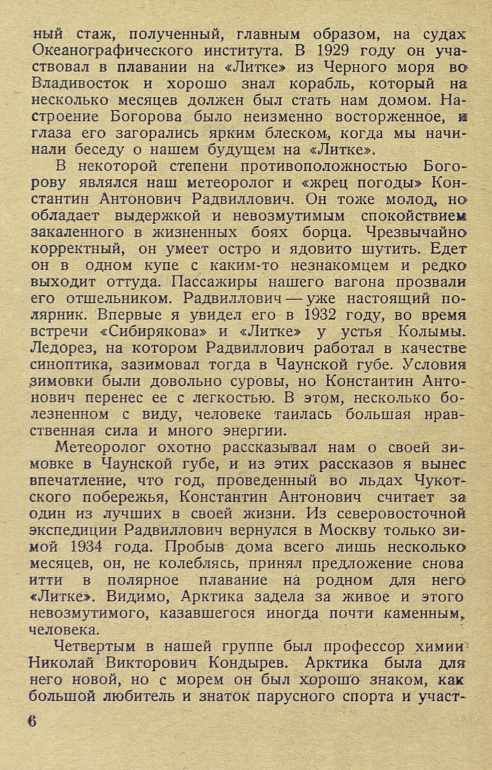 ный стаж, полученный, главным образом, на судах Океанографического института. В 1929 году он участвовал в плавании на «Литке» из Черного моря во Владивосток и хорошо знал корабль, который на несколько месяцев должен был стать нам домом. Настроение Богорова было неизменно восторженное, и глаза его загорались ярким блеском, когда мы начинали беседу о нашем будущем на «Литке».