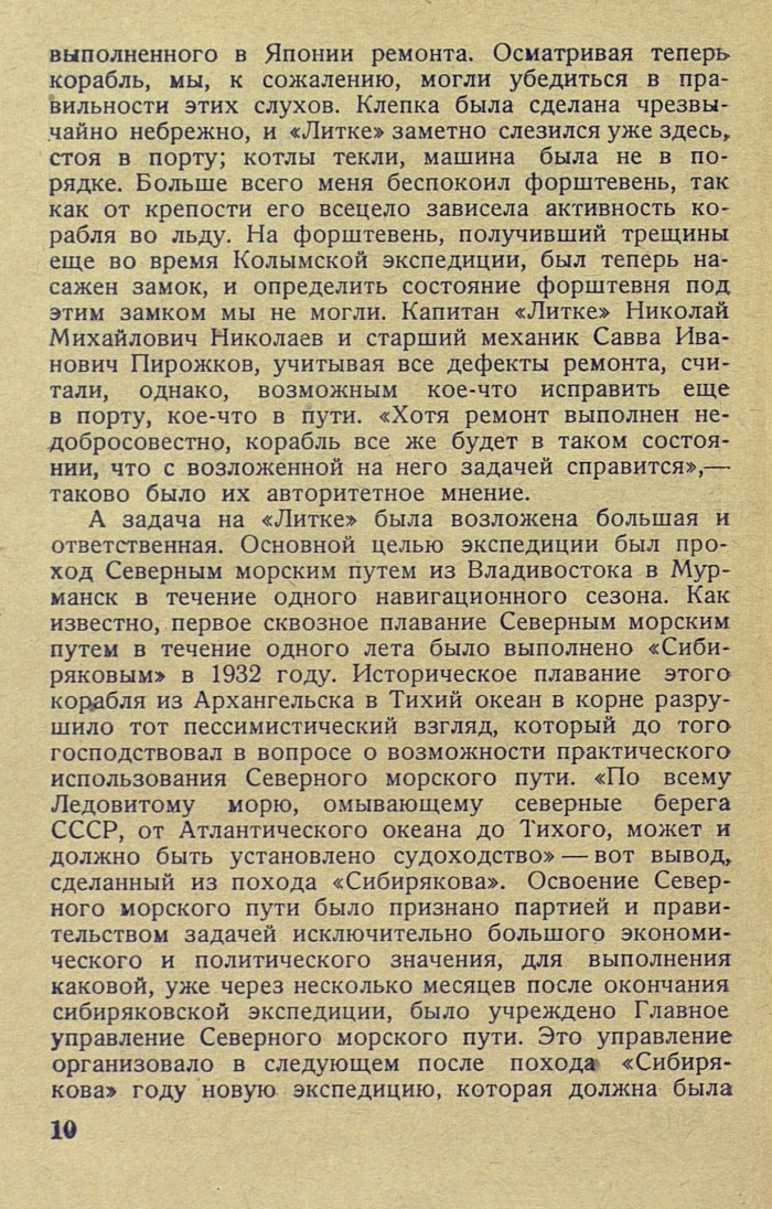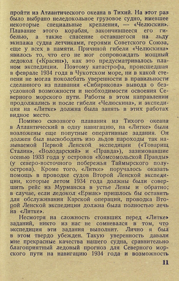 пройти из Атлантического океана в Тихий. На этот раз было выбрано неледокольное грузовое судно, имевшее некоторые специальные крепления, — «Челюскин». Плавание этого корабля, закончившееся его гибелью, а также спасение оставшегося на льду экипажа судна летчиками, героями Советского Союза, еще у всех в памяти. Причиной гибели «Челюскина» явилось то, что его не мог сопровождать мощный ледокол («Красин»), как это предусматривалось планом экспедиции. Поэтому катастрофа, происшедшая в феврале 1934 года в Чукотском море, ни в какой степени не могла поколебать уверенности в правильности сделанного из плавания «Сибирякова» вывода о безусловной возможности и необходимости освоения Северного морского пути. Работы в этом направлении продолжались и после гибели «Челюскина», и экспедиция на «Литке» должна была занять в этих работах видное место.