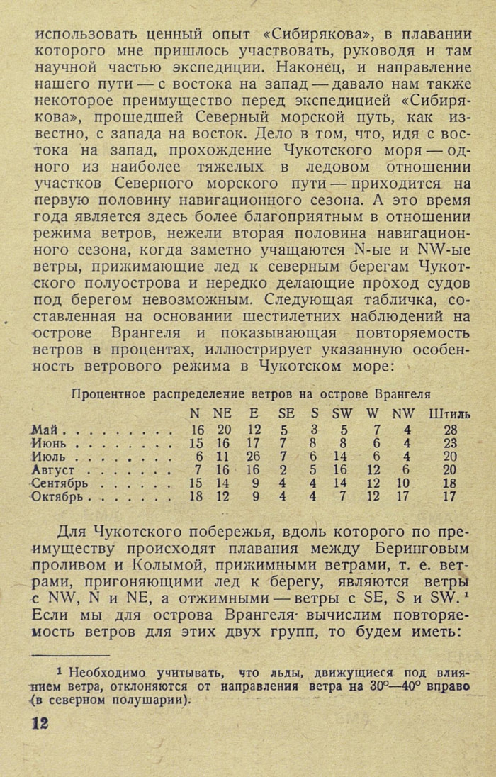 использовать ценный опыт «Сибирякова», в плавании которого мне пришлось участвовать, руководя и там научной частью экспедиции. Наконец, и направление нашего пути — с востока на запад — давало нам также некоторое преимущество перед экспедицией «Сибирякова», прошедшей Северный морской путь, как известно, с запада на восток. Дело в том, что, идя с востока на запад, прохождение Чукотского моря — одного из наиболее тяжелых в ледовом отношении участков Северного морского пути — приходится на первую половину навигационного сезона. А это время года является здесь более благоприятным в отношении режима ветров, нежели вторая половина навигационного сезона, когда заметно учащаются N-ые и NW-ые ветры, прижимающие лед к северным берегам Чукотского полуострова и нередко делающие проход судов под берегом невозможным. Следующая табличка, составленная на основании шестилетних наблюдений на острове Врангеля и показывающая повторяемость ветров в процентах, иллюстрирует указанную особенность ветрового режима в Чукотском море: