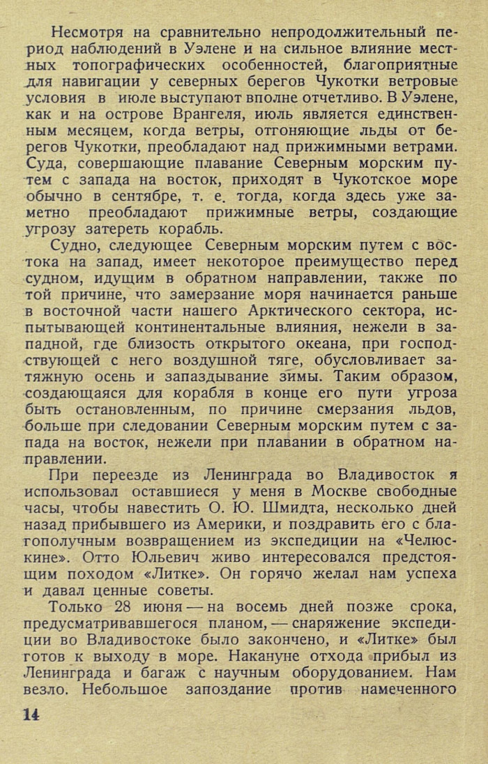 При переезде из Ленинграда во Владивосток я использовал оставшиеся у меня в Москве свободные часы, чтобы навестить О. Ю. Шмидта, несколько дней назад прибывшего из Америки, и поздравить его с благополучным возвращением из экспедиции на «Челюскине». Отто Юльевич живо интересовался предстоящим походом «Литке». Он горячо желал нам успеха и давал ценные советы.
