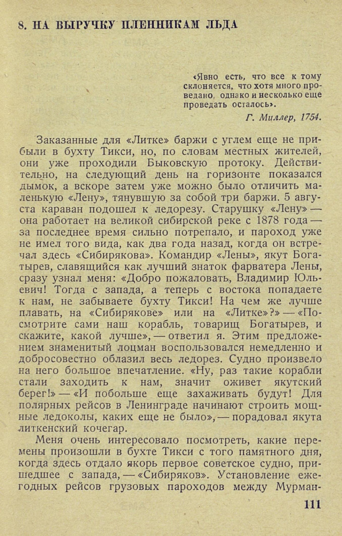 Заказанные для «Литке» баржи с углем еще не прибыли в бухту Тикси, но, по словам местных жителей, они уже проходили Быковскую протоку. Действительно, на следующий день на горизонте показался дымок, а вскоре затем уже можно было отличить маленькую «Лену», тянувшую за собой три баржи. 5 августа караван подошел к ледорезу. Старушку «Лену» — она работает на великой сибирской реке с 1878 года — за последнее время сильно потрепало, и пароход уже не имел того вида, как два года назад, когда он встречал здесь «Сибирякова». Командир «Лены», якут Богатырев, славящийся как лучший знаток фарватера Лены, сразу узнал меня: «Добро пожаловать, Владимир Юльевич! Тогда с запада, а теперь с востока попадаете к нам, не забываете бухту Тикси! На чем же лучше плавать, на «Сибирякове» или на «Литке»? » — «Посмотрите сами наш корабль, товарищ Богатырев, и скажите, какой лучше», — ответил я. Этим предложением знаменитый лоцман воспользовался немедленно и добросовестно облазил весь ледорез. Судно произвело на него большое впечатление. «Ну, раз такие корабли стали заходить к нам, значит оживет якутский берег! » — «И побольше еще захаживать будут! Для полярных рейсов в Ленинграде начинают строить мощные ледоколы, каких еще не было», — порадовал якута литкенский кочегар.