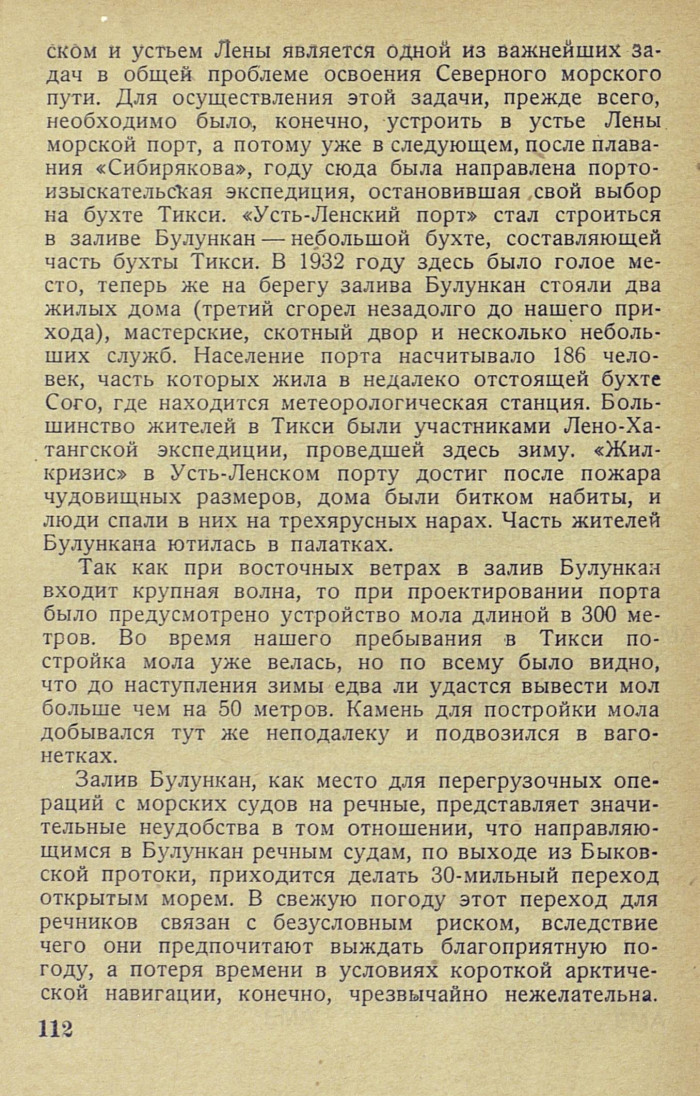 ском и устьем Лены является одной из важнейших задач в общей проблеме освоения Северного морского пути. Для осуществления этой задачи, прежде всего, необходимо было, конечно, устроить в устье Лены морской порт, а потому уже в следующем, после плавания «Сибирякове», году сюда была направлена портоизыскательская экспедиция, остановившая свой выбор на бухте Тикси. «Усть-Ленский порт» стал строиться в заливе Булункан — небольшой бухте, составляющей часть бухты Тикси. В 1932 году здесь было голое место, теперь же на берегу залива Булункан стояли два жилых дома (третий сгорел незадолго до нашего прихода), мастерские, скотный двор и несколько небольших служб. Население порта насчитывало 186 человек, часть которых жила в недалеко отстоящей бухте Сого, где находится метеорологическая станция. Большинство жителей в Тикси были участниками Лено-Хатангской экспедиции, проведшей здесь зиму. «Жилкризис» в Усть-Ленском порту достиг после пожара чудовищных размеров, дома были битком набиты, и люди спали в них на трехярусных нарах. Часть жителей Булункана ютилась в палатках.