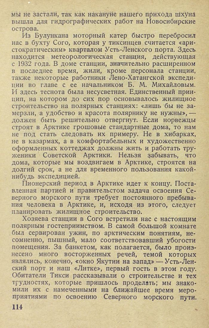 Из Булункана моторный катер быстро перебросил нас в бухту Сого, которая у тиксинцев считается «аристократическим» кварталом Усть-Ленского порта. Здесь находится метеорологическая станция, действующая с 1932 года. В доме станции, значительно расширенном в последнее время, жили, кроме персонала станции, также некоторые работники Лено-Хатангской экспедиции во главе с ее начальником Б. М. Михайловым. И здесь теснота была несусветная. Единственный принцип, на котором до сих пор основывалось жилищное строительство на полярных станциях: «лишь бы не замерзли, а удобство и красота полярнику не нужны», — должен быть решительно отвергнут. Если норвежцы строят в Арктике грошовые стандартные дома, то нам не под стать следовать их примеру. Не в хибарках, не в казармах, а в комфортабельных и художественно оформленных коттеджах должны жить и работать труженики Советской Арктики. Нельзя забывать, что дома, которые мы воздвигаем в Арктике, строятся на долгий срок, а не для временного пользования какой-нибудь экспедицией.
